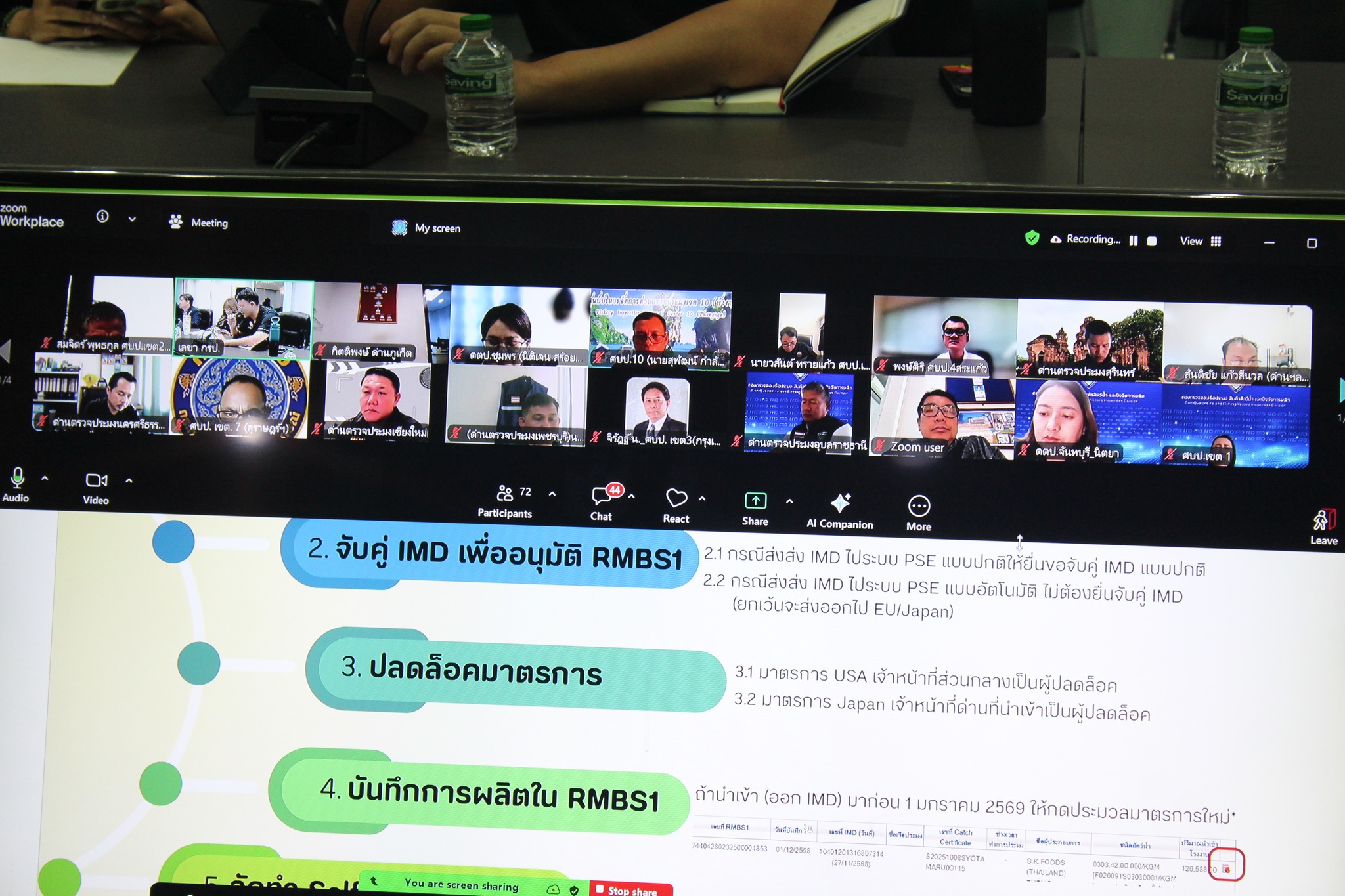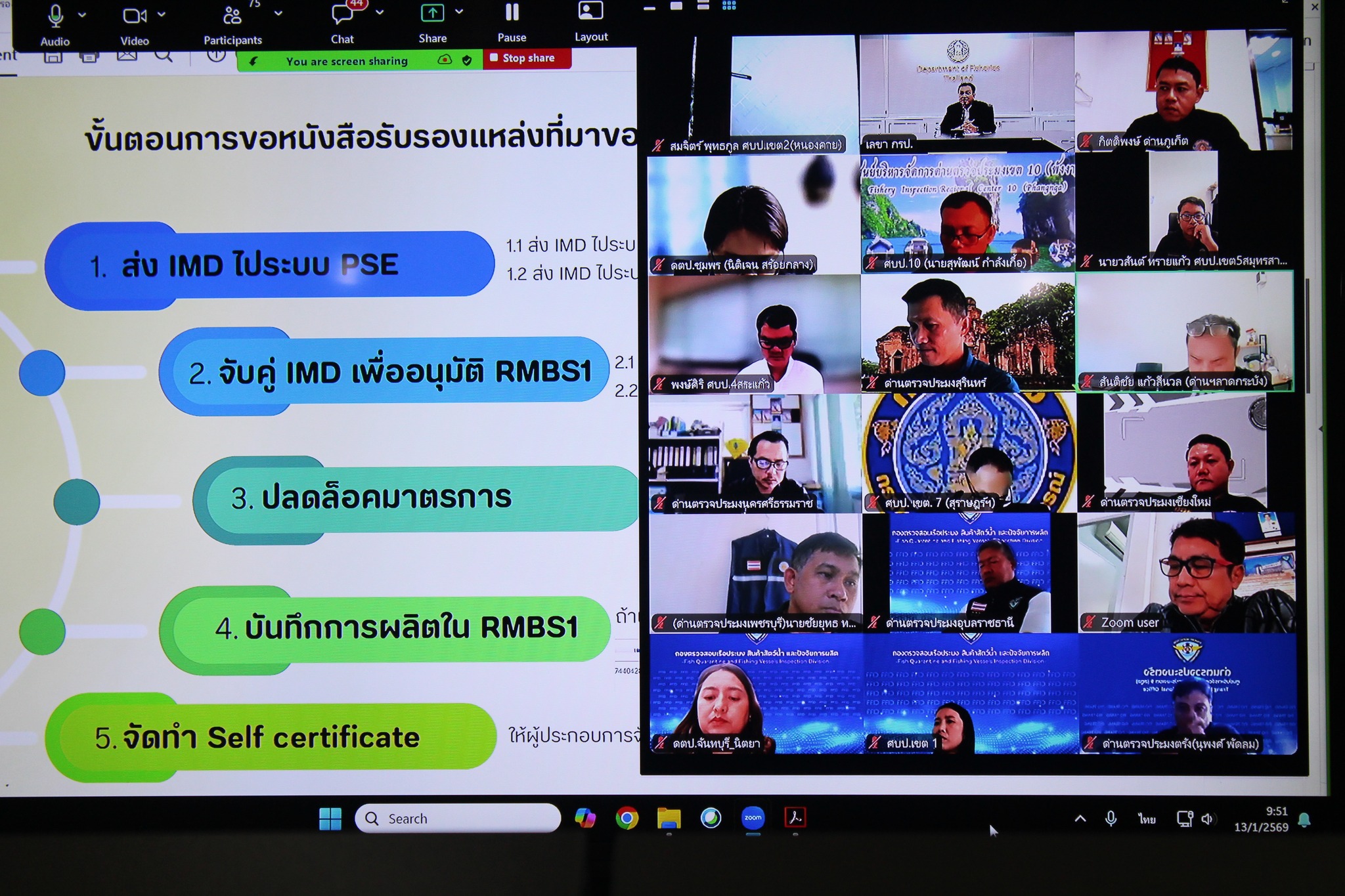 เมื่อวันอังคารที่ 13 มกราคม 2569 เวลา 09.30 น. นายซุลกีฟลี ลติฟีปุตรา ผู้อำนวยการกองตรวจสอบเรือประมง สินค้าสัตว์น้ำ และปัจจัยการผลิต กรมประมง เป็นประธานในการประชุมกองฯ พร้อมด้วยหัวหน้ากลุ่มฯ/ฝ่ายฯ ผู้อำนวยการศูนย์บริหารจัดการด่านประมงเขต 1-10 หัวหน้าด่านตรวจประมง และเจ้าหน้าที่ในสังกัดกองตรวจสอบเรือประมง สินค้าสัตว์น้ำ และปัจจัยการผลิต เข้าร่วมประชุม ณ ห้องประชุมตะพัดทอง ชั้น 2 อาคารกองประมงต่างประเทศ กรมประมง และผ่านระบบออนไลน์ Zoom Meeting รับฟังปัญหาอุปสรรคในการทำงาน งบประมาณ บุคลากร สถานที่ตั้งศูนย์ฯ/ด่านฯ การก่อสร้างด่านฯ รถราชการ ให้คำแนะนำแนวทางการปฎิบัติงาน ตัวชี้วัด และเน้นย้ำการปฏิบัติงานด้านต่างๆ แนะนำการปฎิบัติงานของด่านฯที่ติดชายแดน ที่ได้รับผลกระทบจากปัญหาความขัดแย้ง การใช้มาตรการการควบคุมการส่งออกสัตว์น้ำหรือผลิตภัณฑ์สัตว์น้ำไปยังสหรัฐอเมริกา ภายใต้กฎหมายว่าด้วยการนำเข้าสินค้าสัตว์น้ำ เพื่อคุ้มครองสัตว์ทะเลที่เลี้ยงลูกด้วยนม MMPA