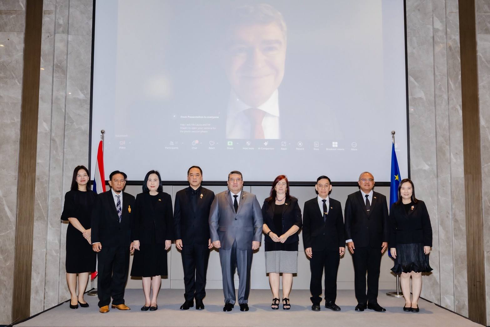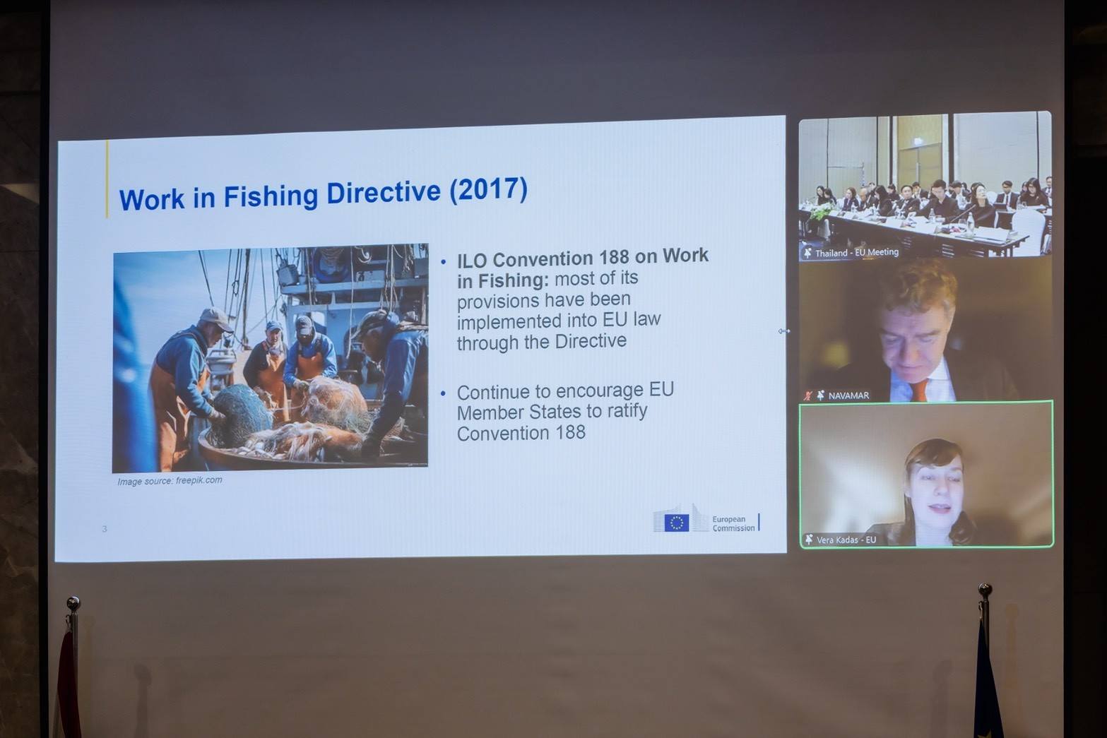 นางฐิติพร หลาวประเสริฐ อธิบดีกรมประมงมอบหมายให้นายประเทศ ซอรักษ์ รองอธิบดีกรมประมง พร้อมด้วยนายสุเมธ เชิงสะอาด นักวิชาการประมงชำนาญการ กลุ่มตรวจสอบเรือประมง กองตรวจสอบเรือประมง สินค้าสัตว์น้ำและปัจจัยการผลิต เข้าร่วมการประชุมระดับสูงด้านแรงงานระหว่างไทยกับสหภาพยุโรป ครั้งที่ 4 โดยมี Mr. Mario Nava ปลัดกระทรวงการจ้างงาน กิจการสังคม และการหลอมรวมทางสังคม คณะกรรมาธิการยุโรป เข้าร่วมเป็นประธานฝ่ายสหภาพยุโรปผ่านระบบการประชุมทางไกล และ Ms. Sara Rezoagli อุปทูตสหภาพยุโรปประจำประเทศไทย พันตำรวจโท วรรณพงษ์ คชรักษ์ ปลัดกระทรวงแรงงาน เป็นประธานร่วมฝ่ายไทย พร้อมด้วยผู้บริหารระดับสูงของกระทรวงแรงงาน กรมพัฒนาฝีมือแรงงาน กรมสวัสดิการและคุ้มครองแรงงาน กรมการจัดหางาน สำนักงานประกันสังคม และเจ้าหน้าที่ที่เกี่ยวข้องเข้าร่วม
