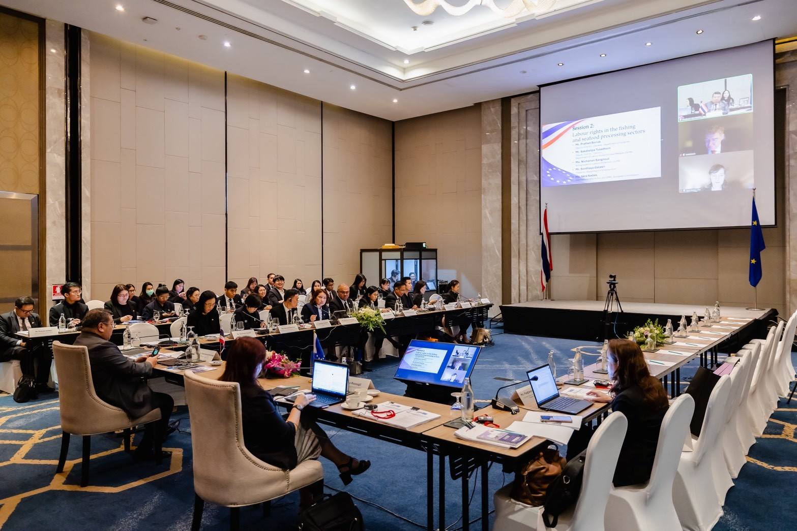 โดยกรมประมงได้นำเสนอข้อมูลในประเด็นพัฒนากฎหมายประมงและการตรวจแรงงานภาคประมง ภายใต้หัวข้อสิทธิแรงงานในกิจการประมงและการแปรรูปอาหารทะเล (Labour rights in the fishing and seafood processing sectors) ร่วมกับผู้แทนกรมสวัสดิการและคุ้มครองแรงงาน และกรมการจัดหางานนอกจากนี้ การประชุมดังกล่าวยังได้มีการแลกเปลี่ยนแนวปฏิบัติที่ดีของสหภาพยุโรป ไม่ว่าจะเป็นเรื่องของแรงงานเด็ก แรงงานบังคับ แรงงานประมง แรงงานในเศรษฐกิจแพลตฟอร์ม และกระชับความร่วมมือในการยกระดับมาตรฐานการคุ้มครองสิทธิแรงงานไทยสู่สากล พร้อมรับมือความท้าทายในโลกการทำงานยุคใหม่ต่อไป