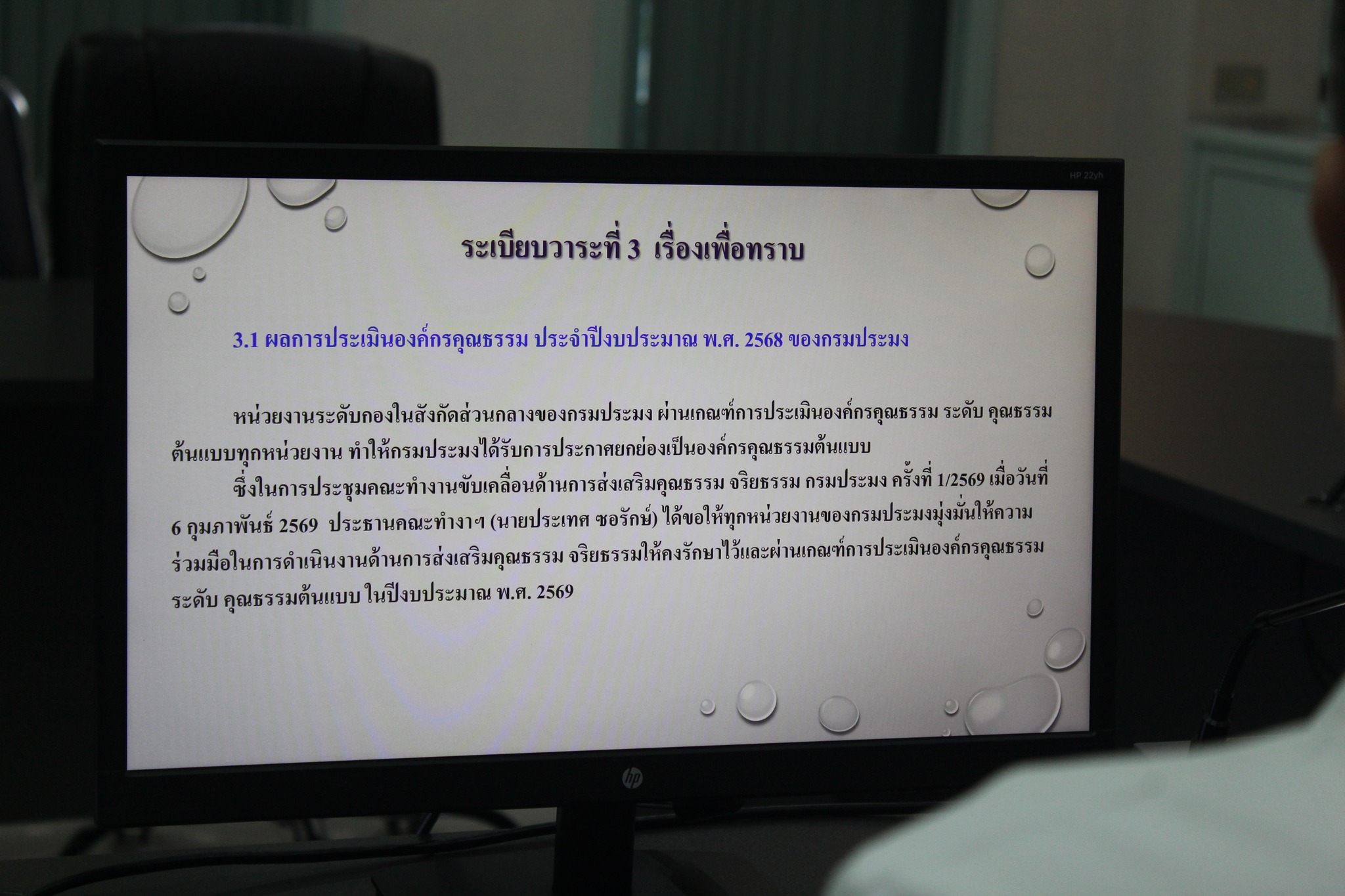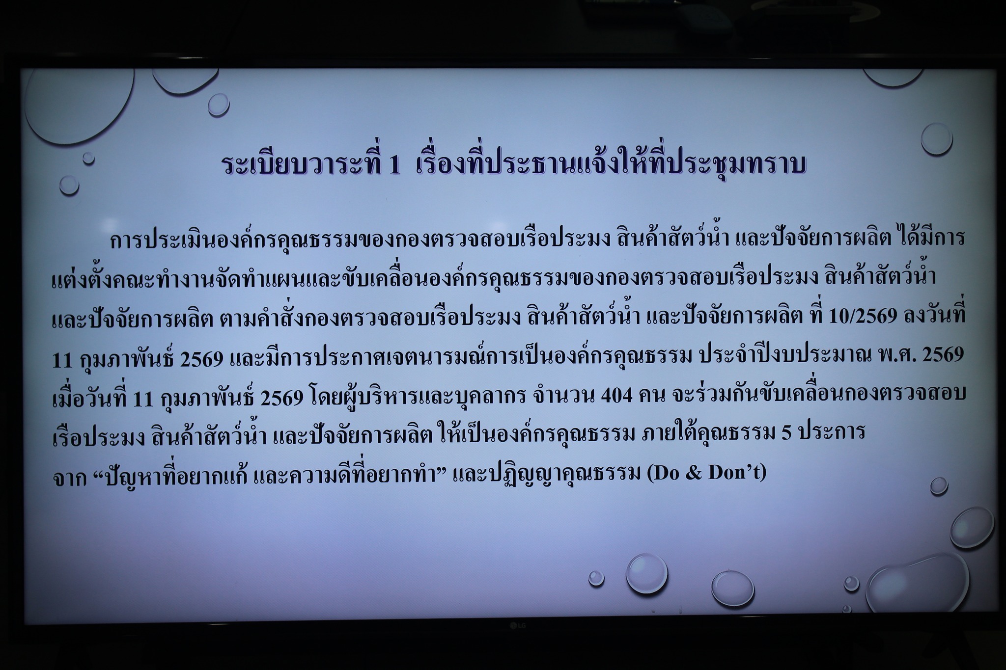 วันอังคารที่ 17 มีนาคม 2569 เวลา 09.30 น. ณ ห้องประชุมตะพัดทอง ชั้น 2 อาคารกองประมงต่างประเทศ นายซุลกีฟลี ลติฟีปุตรา ผู้อำนวยการกองตรวจสอบเรือประมง สินค้าสัตว์น้ำ และปัจจัยการผลิต กรป. กรมประมง เป็นประธานการประชุม พร้อมหัวหน้ากลุ่มฯ/ฝ่ายฯ และเจ้าหน้าที่ที่เกี่ยวข้อง ร่วมประชุมคณะทำงานจัดทำแผนและขับเคลื่อนองค์กรคุณธรรม ของกองตรวจสอบเรือประมง สินค้าสัตว์น้ำ และปัจจัยการผลิต ตามคำสั่งที่ 10/2569 ลงวันที่ 11 กุมภาพันธ์ 2569 และมีการประกาศเจตนารมณ์การเป็นองค์กรคุณธรรม โดยผู้บริหารและบุคลากร จำนวน 404 คน จะร่วมกันขับเคลื่อน กรป. ให้เป็นองค์กรคุณธรรม ภายใต้คุณธรรม 5 ประการ จาก "ปัญหาที่อยากแก้ และความดีที่อยากทำ" และปฏิญญาคุณธรรม (Do & Don't)