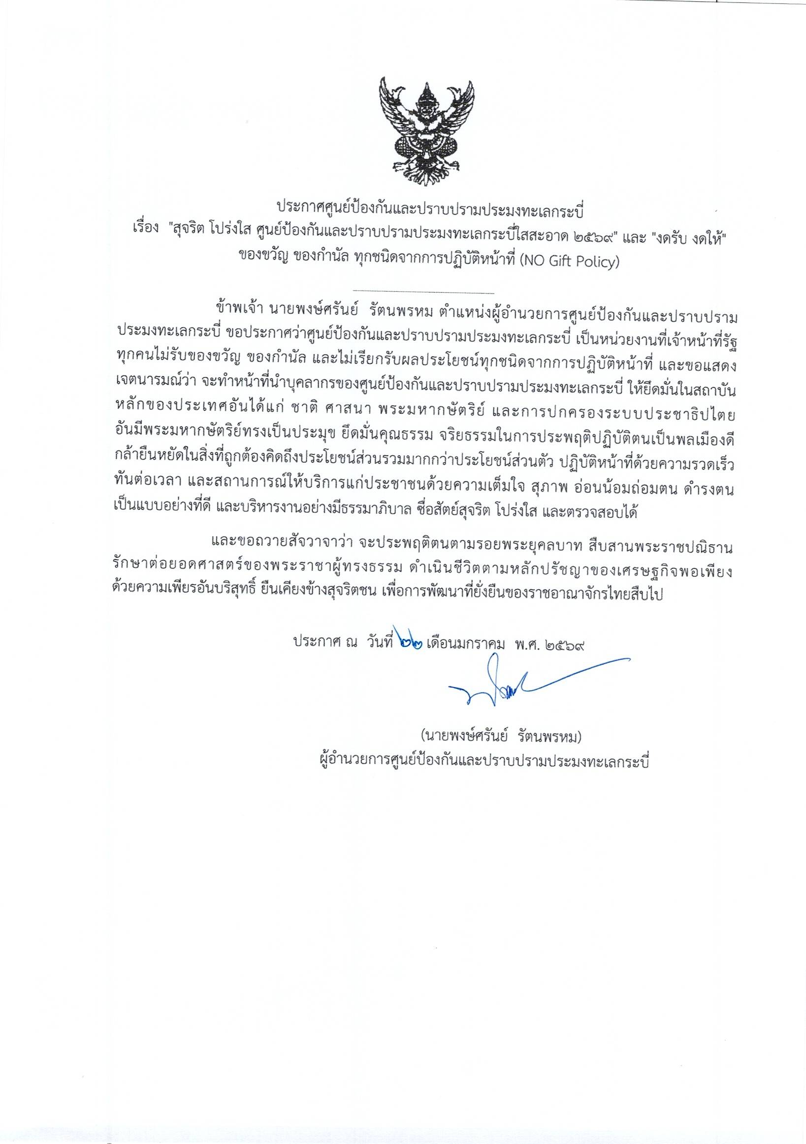 ประกาศศูนย์ป้องกันและปราบปรามประมงทะเลกระบี่ เรื่อง "สุจริต โปร่งใส ศูนย์ป้องกันและปราบปรามประมงทะเลกระบี่ใสสะอาด 2569" และ "งดรับ งดให้" ของขวัญ ของกำนัล ทุกชนิดจากการปฏิบัติหน้าที่ (NO Gift Policy)