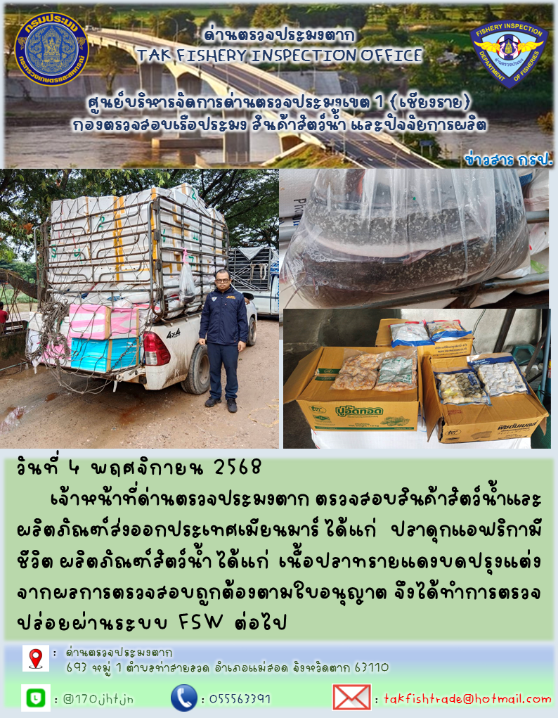 เจ้าหน้าที่ด่านตรวจประมงตาก ตรวจสอบสินค้าสัตว์น้ำและผลิตภัณฑ์ส่งออกประเทศเมียนมาร์ ได้แก่  ปลาดุกแอฟริกามีชีวิต ผลิตภัณฑ์สัตว์น้ำ ได้แก่ เนื้อปลาทรายแดงบดปรุงแต่ง จากผลการตรวจสอบถูกต้องตามใบอนุญาต จึงได้ทำการตรวจปล่อยผ่านระบบ FSW ต่อไป