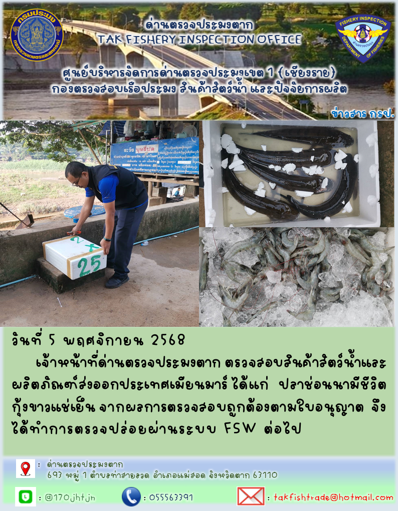 เจ้าหน้าที่ด่านตรวจประมงตาก ตรวจสอบสินค้าสัตว์น้ำและผลิตภัณฑ์ส่งออกประเทศเมียนมาร์ ได้แก่  ปลาช่อนนามีชีวิต กุ้งขาวแช่เย็น จากผลการตรวจสอบถูกต้องตามใบอนุญาต จึงได้ทำการตรวจปล่อยผ่านระบบ FSW ต่อไป