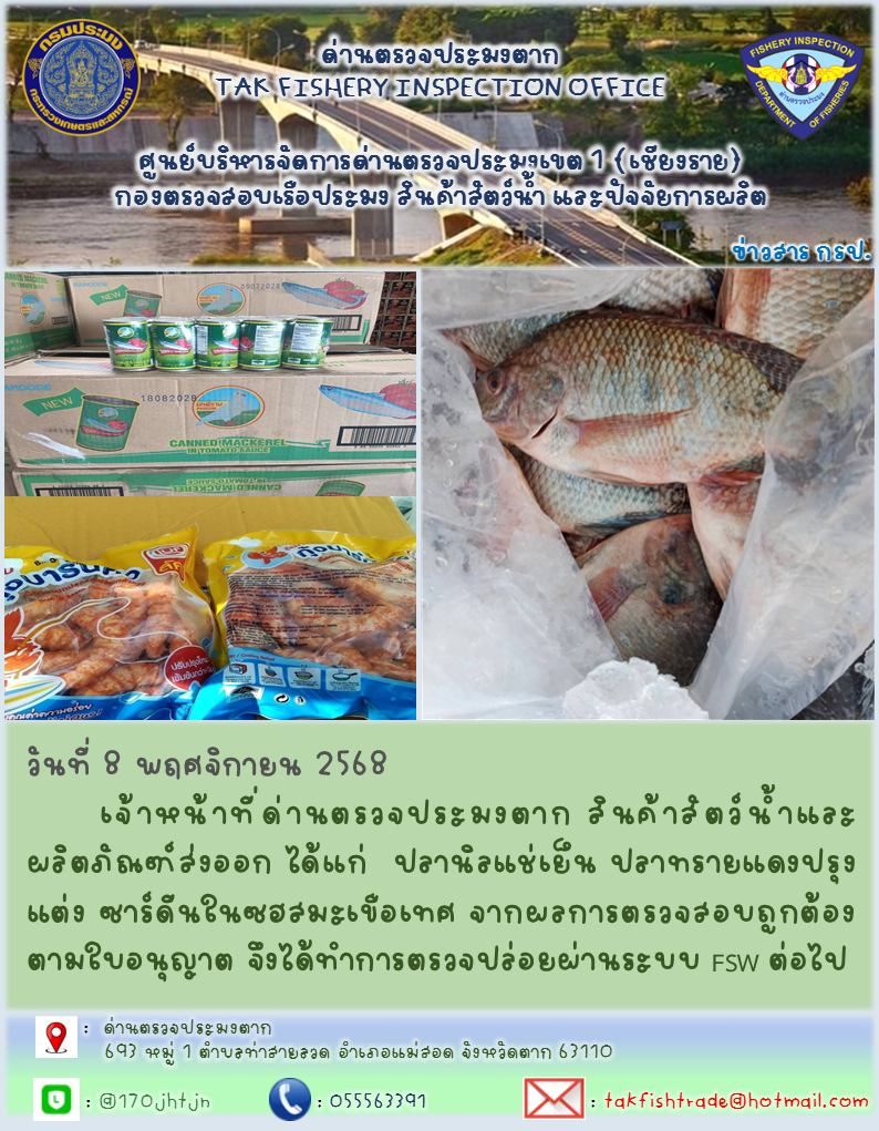 เจ้าหน้าที่ด่านตรวจประมงตาก สินค้าสัตว์น้ำและผลิตภัณฑ์ส่งออก ได้แก่  ปลานิลแช่เย็น ปลาทรายแดงปรุงแต่ง ซาร์ดีนในซฮสมะเขือเทศ จากผลการตรวจสอบถูกต้องตามใบอนุญาต จึงได้ทำการตรวจปล่อยผ่านระบบ FSW ต่อไป