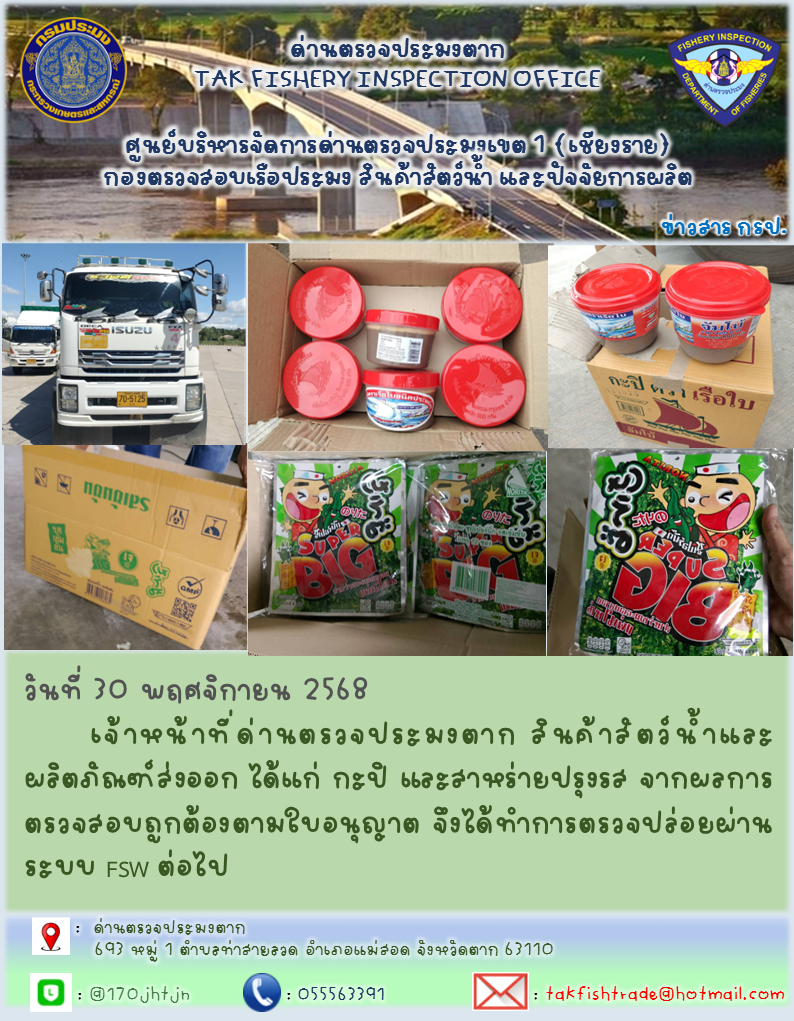 เจ้าหน้าที่ด่านตรวจประมงตาก สินค้าสัตว์น้ำและผลิตภัณฑ์ส่งออก ได้แก่ กะปิ และสาหร่ายปรุงรส จากผลการตรวจสอบถูกต้องตามใบอนุญาต จึงได้ทำการตรวจปล่อยผ่านระบบ FSW ต่อไป