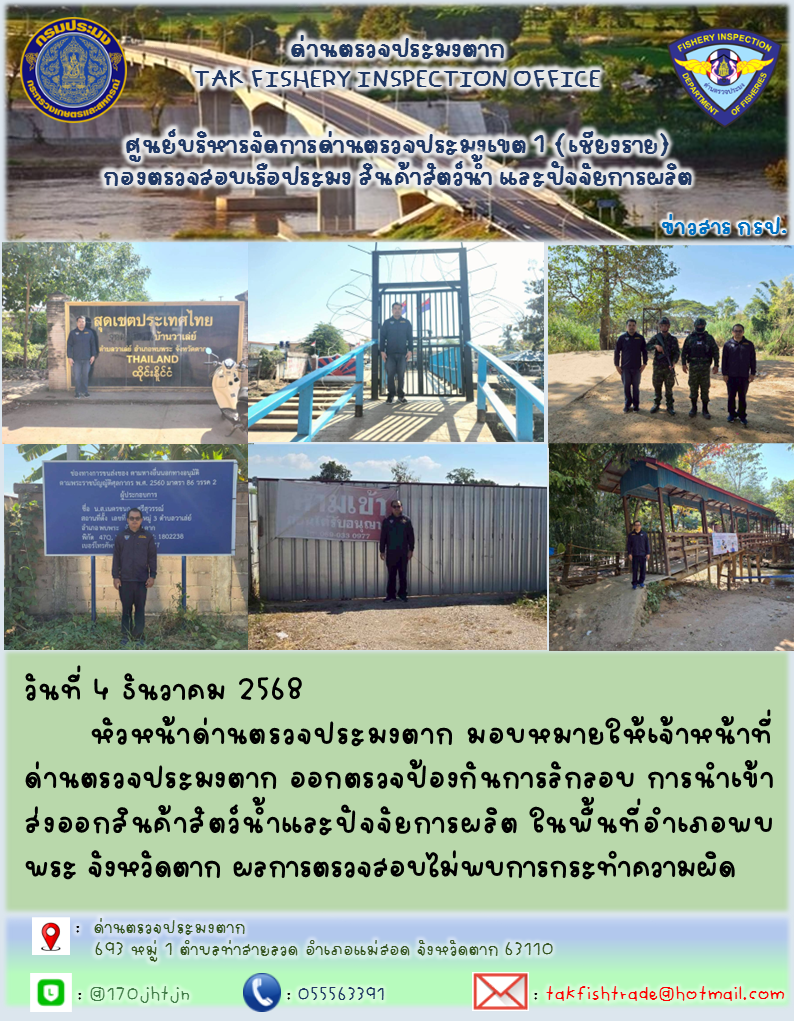 หัวหน้าด่านตรวจประมงตาก มอบหมายให้เจ้าหน้าที่ด่านตรวจประมงตาก ออกตรวจป้องกันการลักลอบ การนำเข้า ส่งออกสินค้าสัตว์น้ำและปัจจัยการผลิต ในพื้นที่อำเภอพบพระ จังหวัดตาก ผลการตรวจสอบไม่พบการกระทำความผิด