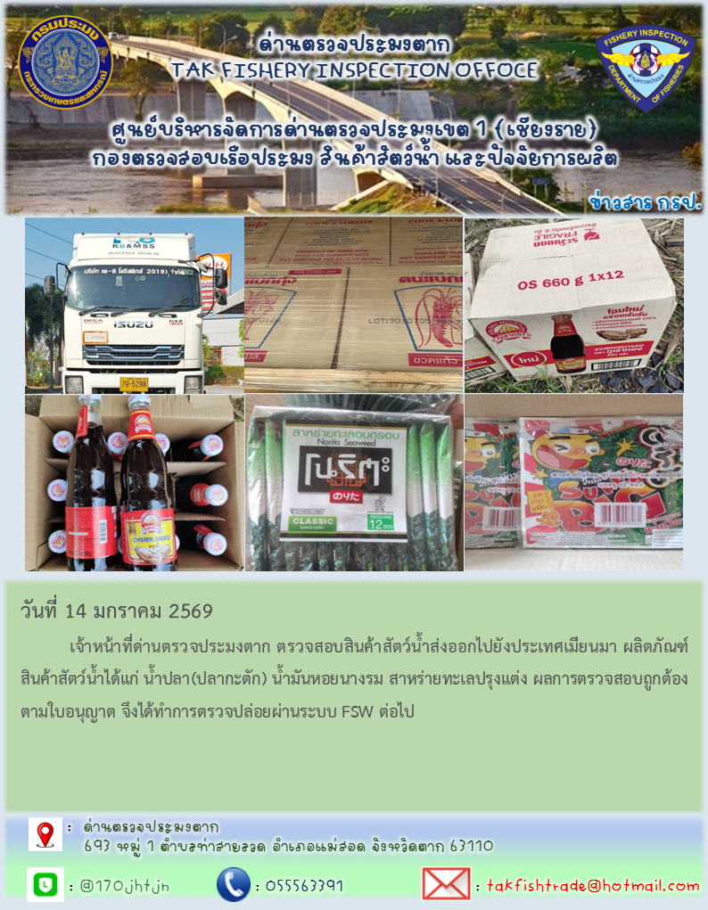 วันที่ 14 มกราคม 2569 เจ้าหน้าที่ด่านตรวจประมงตาก ตรวจสอบสินค้าสัตว์น้ำส่งออกไปยังประเทศเมียนมา ผลิตภัณฑ์สินค้าสัตว์น้ำได้แก่ น้ำปลา(ปลากะตัก) น้ำมันหอยนางรม สาหร่ายทะเลปรุงแต่ง ผลการตรวจสอบถูกต้องตามใบอนุญาต จึงได้ทำการตรวจปล่อยผ่านระบบ FSW ต่อไป