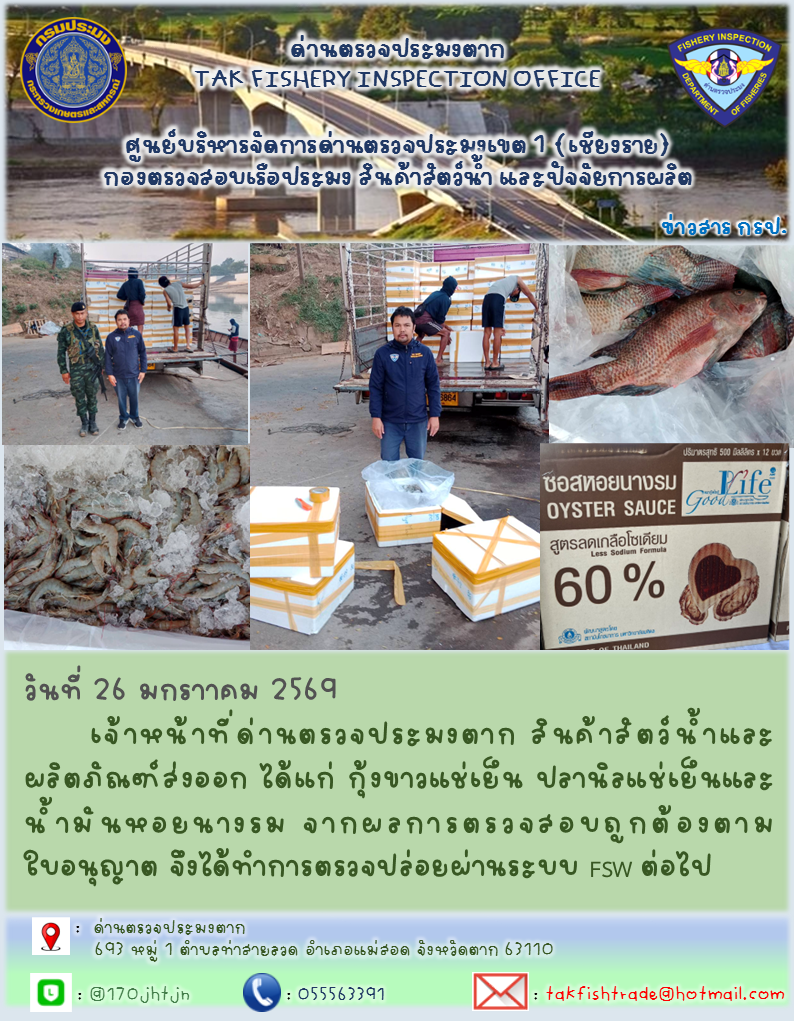 เจ้าหน้าที่ด่านตรวจประมงตาก สินค้าสัตว์น้ำและผลิตภัณฑ์ส่งออก ได้แก่ กุ้งขาวแช่เย็น ปลานิลแช่เย็นและน้ำมันหอยนางรม จากผลการตรวจสอบถูกต้องตามใบอนุญาต จึงได้ทำการตรวจปล่อยผ่านระบบ FSW ต่อไป