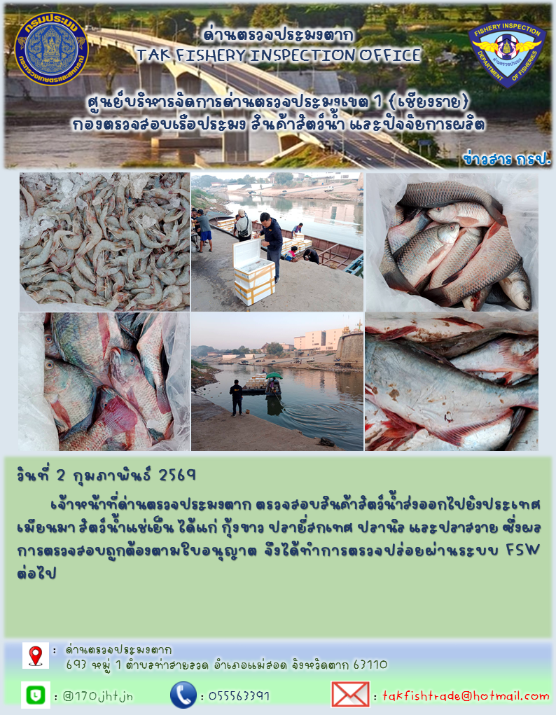 วันที่ 2 กุมภาพันธ์ 2569 เจ้าหน้าที่ด่านตรวจประมงตาก ตรวจสอบสินค้าสัตว์น้ำส่งออกไปยังประเทศเมียนมา สัตว์น้ำแช่เย็น ได้แก่ กุ้งขาว ปลายี่สกเทศ ปลานิล และปลาสวาย ซึ่งผลการตรวจสอบถูกต้องตามใบอนุญาต จึงได้ทำการตรวจปล่อยผ่านระบบ FSW ต่อไป