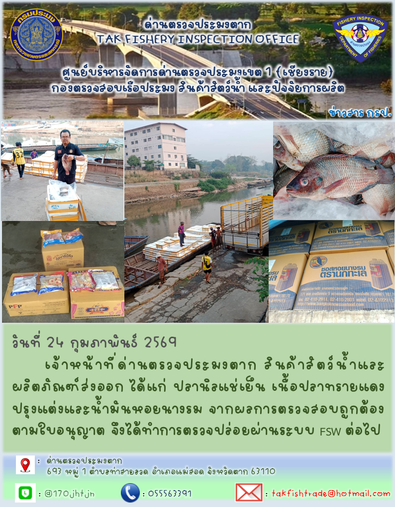 เจ้าหน้าที่ด่านตรวจประมงตาก สินค้าสัตว์น้ำและผลิตภัณฑ์ส่งออก ได้แก่ ปลานิลแช่เย็น เนื้อปลาทรายแดงปรุงแต่งและน้ำมันหอยนางรม จากผลการตรวจสอบถูกต้องตามใบอนุญาต จึงได้ทำการตรวจปล่อยผ่านระบบ FSW ต่อไป