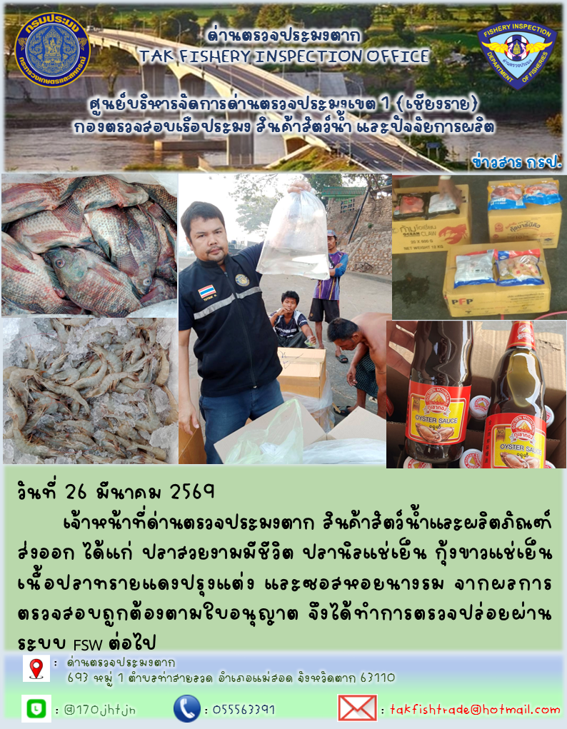 เจ้าหน้าที่ด่านตรวจประมงตาก สินค้าสัตว์น้ำและผลิตภัณฑ์ส่งออก ได้แก่ ปลาสวยงามมีชีวิต ปลานิลแช่เย็น กุ้งขาวแช่เย็น  เนื้อปลาทรายแดงปรุงแต่ง และซอสหอยนางรม จากผลการตรวจสอบถูกต้องตามใบอนุญาต จึงได้ทำการตรวจปล่อยผ่านระบบ FSW ต่อไป