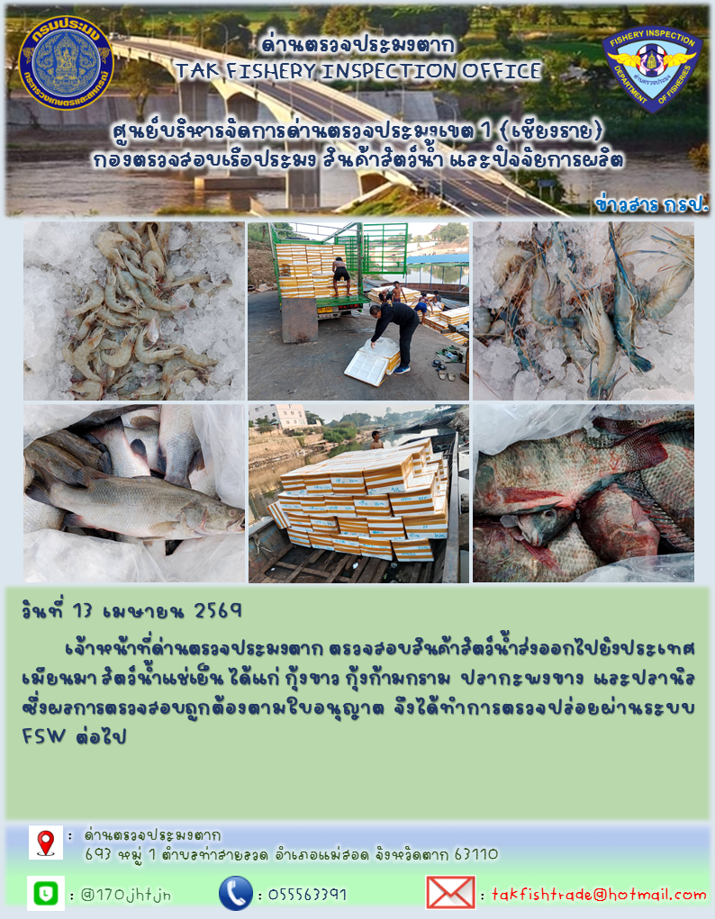 วันที่ 13 เมษายน 2569 เจ้าหน้าที่ด่านตรวจประมงตาก ตรวจสอบสินค้าสัตว์น้ำส่งออกไปยังประเทศเมียนมา สัตว์น้ำแช่เย็น ได้แก่ กุ้งขาว กุ้งก้ามกราม ปลากะพงขาง และปลานิล ซึ่งผลการตรวจสอบถูกต้องตามใบอนุญาต จึงได้ทำการตรวจปล่อยผ่านระบบ FSW ต่อไป