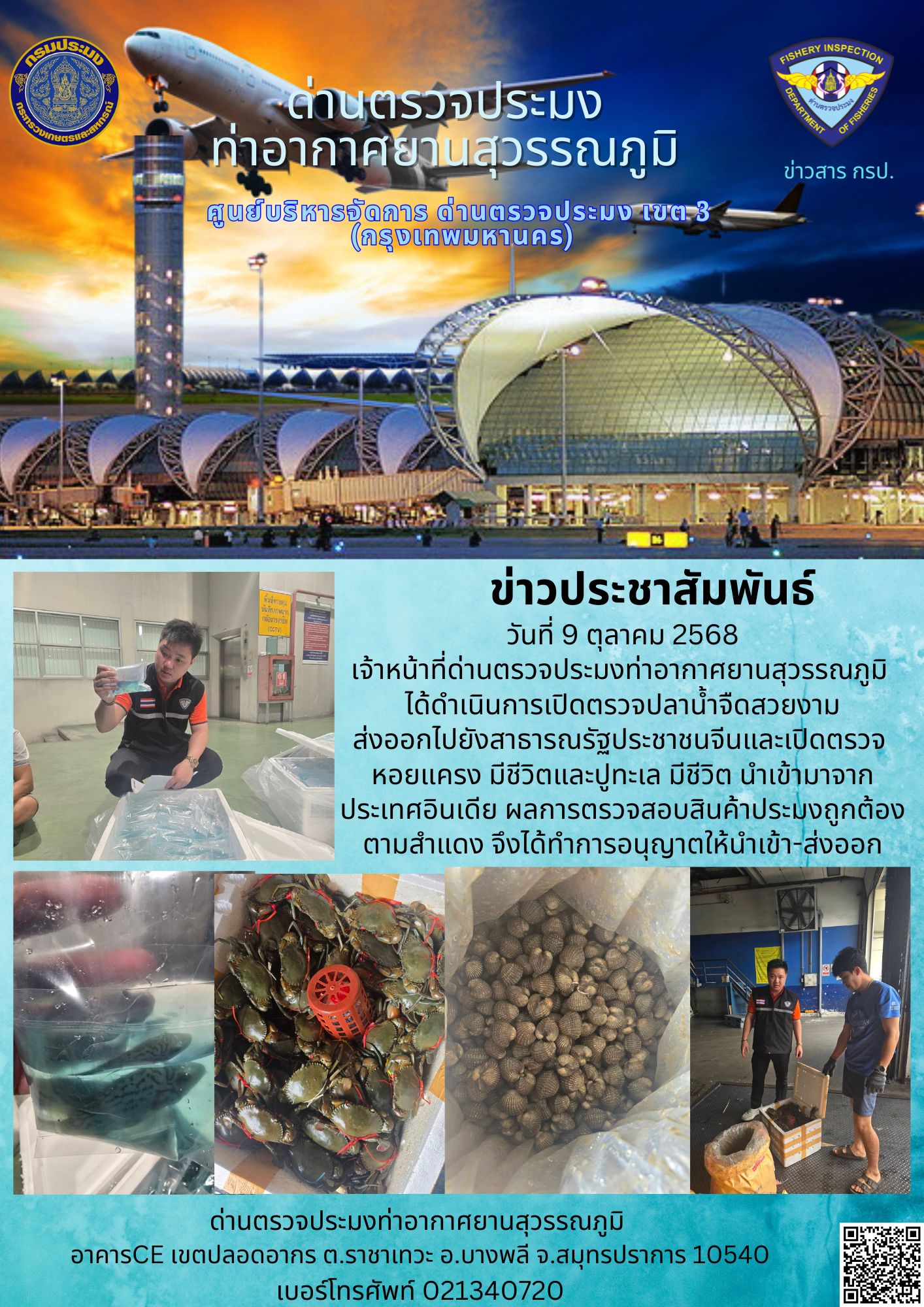 วันที่ 9 ตุลาคม 2568 เจ้าหน้าที่ด่านตรวจประมงท่าอากาศยานสุวรรณภูมิ ได้ดำเนินการเปิดตรวจปลาน้ำจืดสวยงาม ส่งออกไปยังสาธารณรัฐประชาชนจีนและเปิดตรวจ หอยแครง มีชีวิตและปูทะเล มีชีวิต นำเข้ามาจากประเทศอินเดีย ผลการตรวจสอบสินค้าประมงถูกต้องตามสำแดง จึงได้ทำการอนุญาตให้นำเข้า-ส่งออก