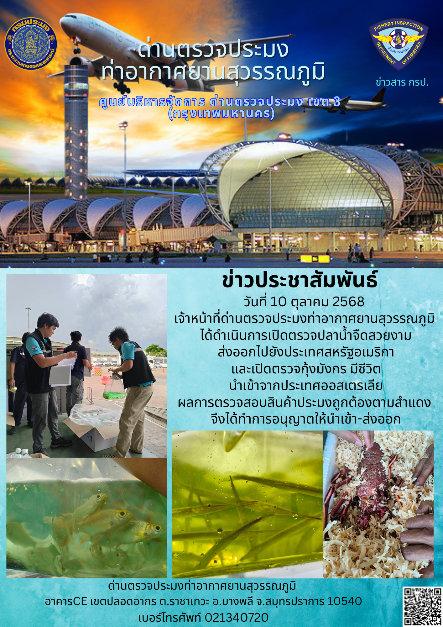 เจ้าหน้าที่ด่านตรวจประมงท่าอากาศยานสุวรรณภูมิ ได้ดำเนินการเปิดตรวจปลาน้ำจืดสวยงาม ส่งออกไปยังประเทศสหรัฐอเมริกา และเปิดตรวจกุ้งมังกร มีชีวิต นำเข้าจากประเทศออสเตรเลีย ผลการตรวจสอบสินค้าประมงถูกต้องตามสำแดง จึงได้ทำการอนุญาตให้นำเข้า-ส่งออก