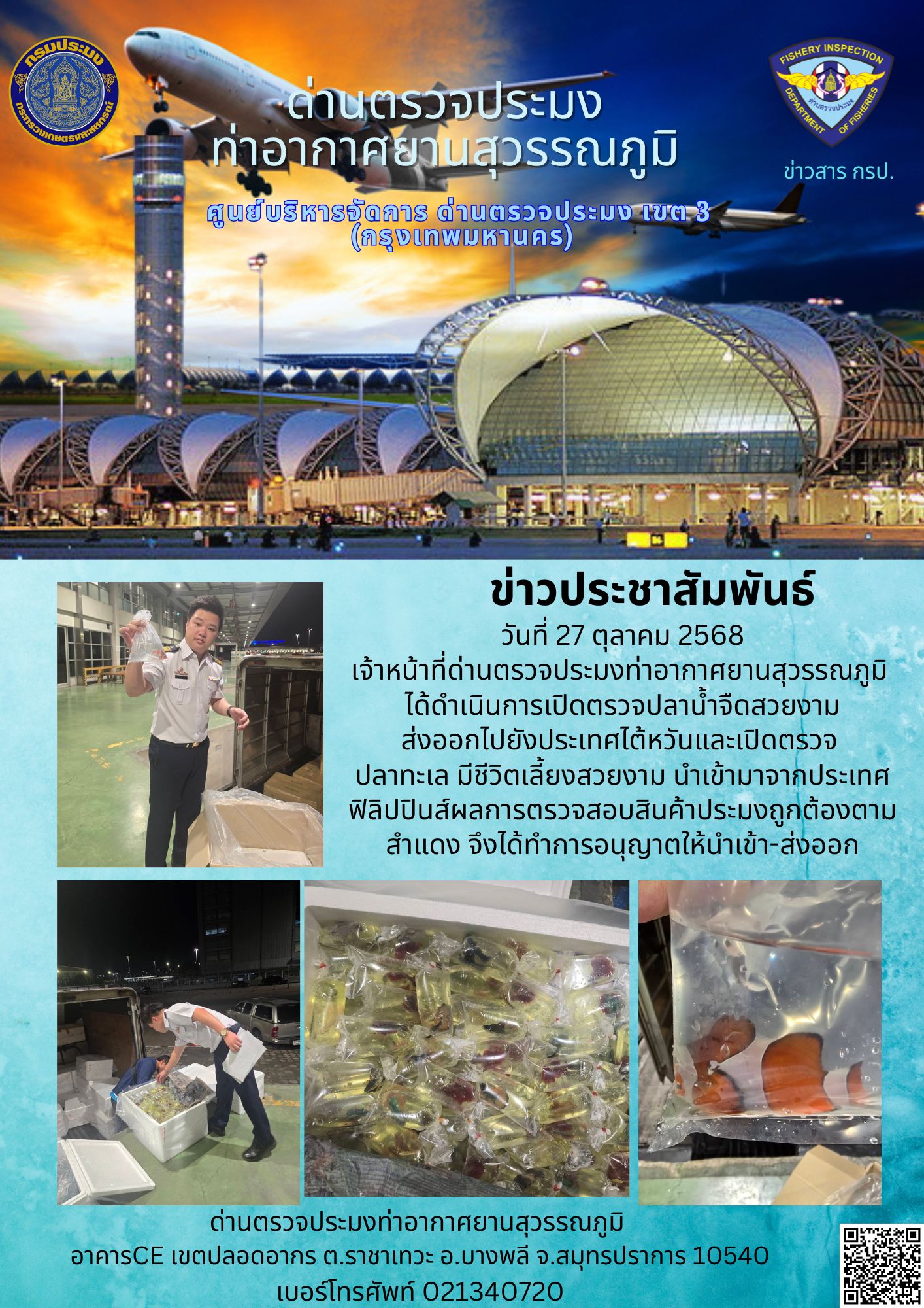 วันที่ 27 ตุลาคม 2568 เจ้าหน้าที่ด่านตรวจประมงท่าอากาศยานสุวรรณภูมิ ได้ดำเนินการเปิดตรวจปลาน้ำจืดสวยงาม ส่งออกไปยังประเทศไต้หวันและเปิดตรวจ ปลาทะเล มีชีวิตเลี้ยงสวยงาม นำเข้ามาจากประเทศฟิลิปปินส์ผลการตรวจสอบสินค้าประมงถูกต้องตามสำแดง จึงได้ทำการอนุญาตให้นำเข้า-ส่งออก