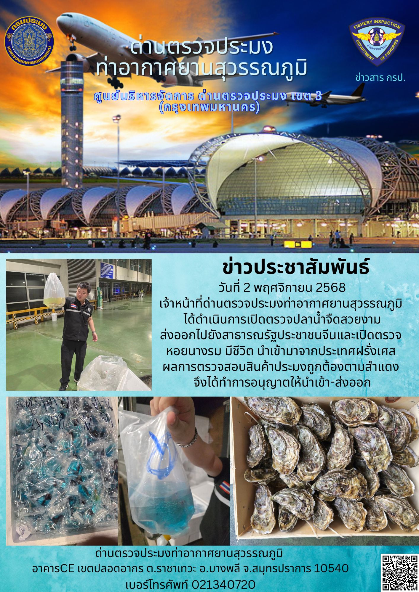วันที่ 2 พฤศจิกายน 2568 เจ้าหน้าที่ด่านตรวจประมงท่าอากาศยานสุวรรณภูมิ ได้ดำเนินการเปิดตรวจปลาน้ำจืดสวยงาม ส่งออกไปยังสาธารณรัฐประชาชนจีนและเปิดตรวจ หอยนางรม มีชีวิต นำเข้ามาจากประเทศฝรั่งเศส ผลการตรวจสอบสินค้าประมงถูกต้องตามสำแดง จึงได้ทำการอนุญาตให้นำเข้า-ส่งออก