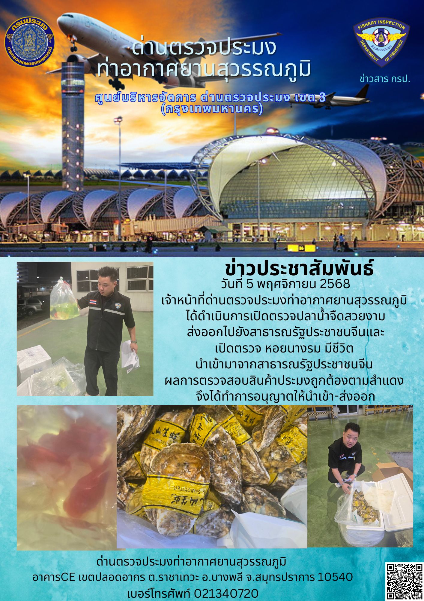 วันที่ 5 พฤศจิกายน 2568 เจ้าหน้าที่ด่านตรวจประมงท่าอากาศยานสุวรรณภูมิ ได้ดำเนินการเปิดตรวจปลาน้ำจืดสวยงาม ส่งออกไปยังสาธารณรัฐประชาชนจีนและ เปิดตรวจ หอยนางรม มีชีวิต