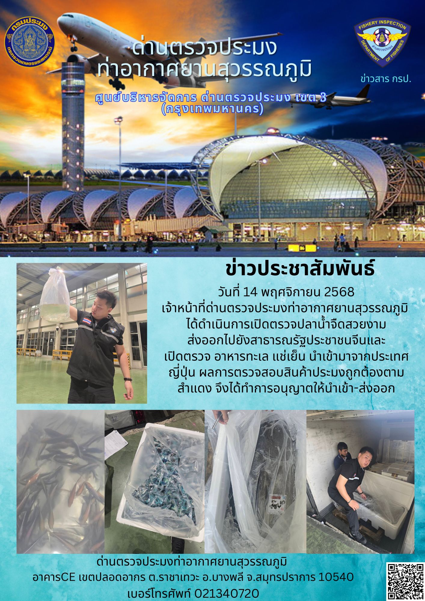 วันที่ 14 พฤศจิกายน 2568 เจ้าหน้าที่ด่านตรวจประมงท่าอากาศยานสุวรรณภูมิ ได้ดำเนินการเปิดตรวจปลาน้ำจืดสวยงาม ส่งออกไปยังสาธารณรัฐประชาชนจีนและเปิดตรวจ อาหารทะเล แช่เย็น นำเข้ามาจากประเทศญี่ปุ่น ผลการตรวจสอบสินค้าประมงถูกต้องตามสำแดง จึงได้ทำการอนุญาตให้นำเข้า-ส่งออก