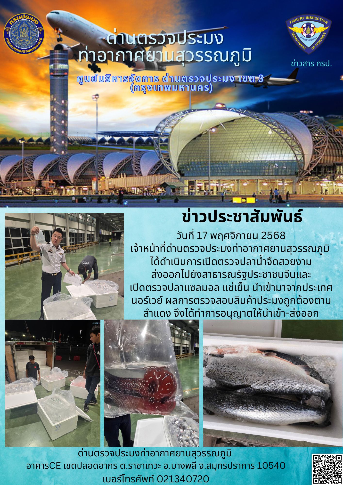 วันที่ 17 พฤศจิกายน 2568 เจ้าหน้าที่ด่านตรวจประมงท่าอากาศยานสุวรรณภูมิ ได้ดำเนินการเปิดตรวจปลาน้ำจืดสวยงาม ส่งออกไปยังสาธารณรัฐประชาชนจีนและเปิดตรวจปลาแซลมอล แช่เย็น นำเข้ามาจากประเทศนอร์เวย์ ผลการตรวจสอบสินค้าประมงถูกต้องตามสำแดง จึงได้ทำการอนุญาตให้นำเข้า-ส่งออก