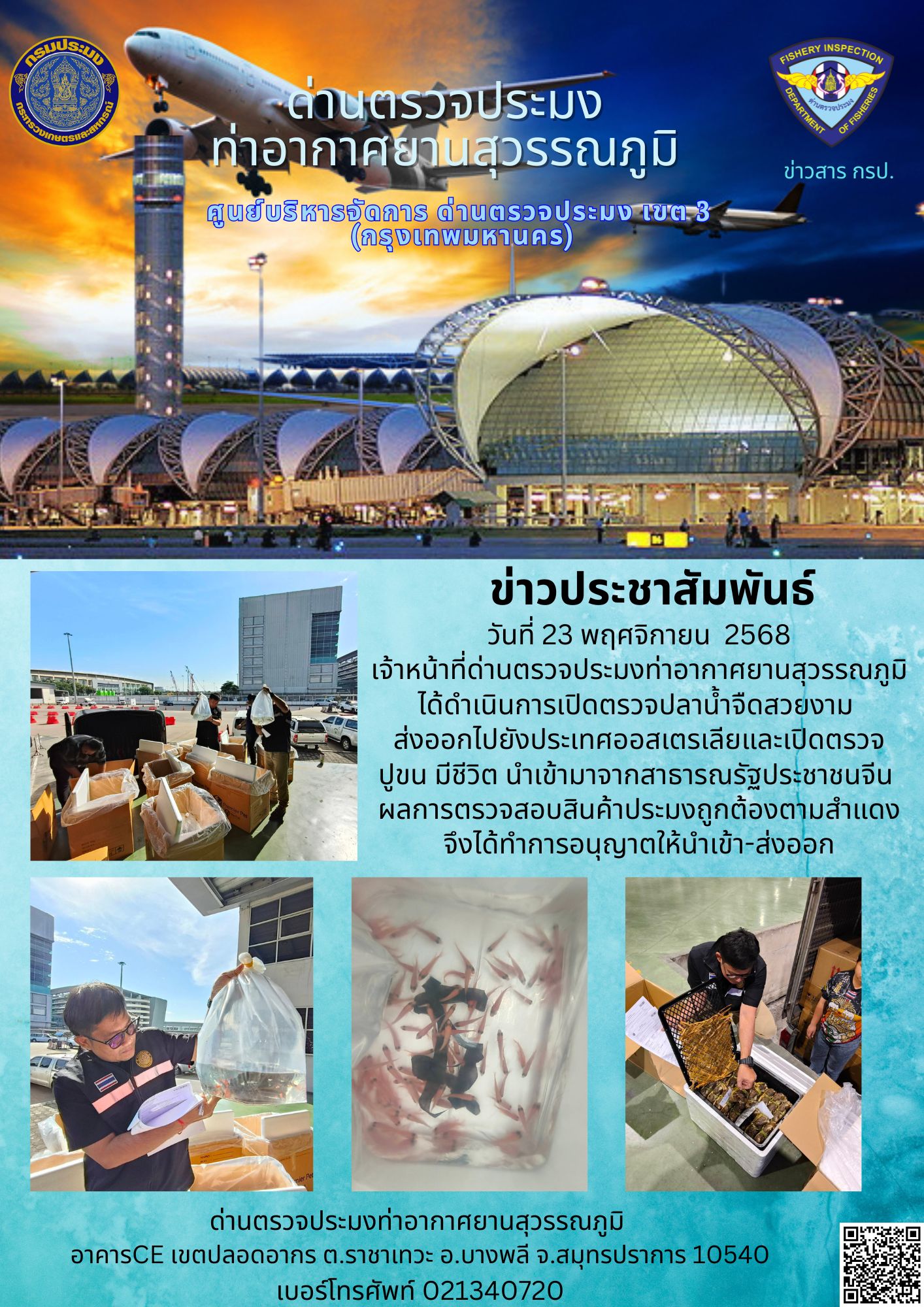 วันที่ 23 พฤศจิกายน 2568 เจ้าหน้าที่ด่านตรวจประมงท่าอากาศยานสุวรรณภูมิ ได้ดำเนินการเปิดตรวจปลาน้ำจืดสวยงาม ส่งออกไปยังประเทศออสเตรเลียและเปิดตรวจ ปูขน มีชีวิต นำเข้ามาจากสาธารณรัฐประชาชนจีน ผลการตรวจสอบสินค้าประมงถูกต้องตามสำแดง จึงได้ทำการอนุญาตให้นำเข้า-ส่งออก