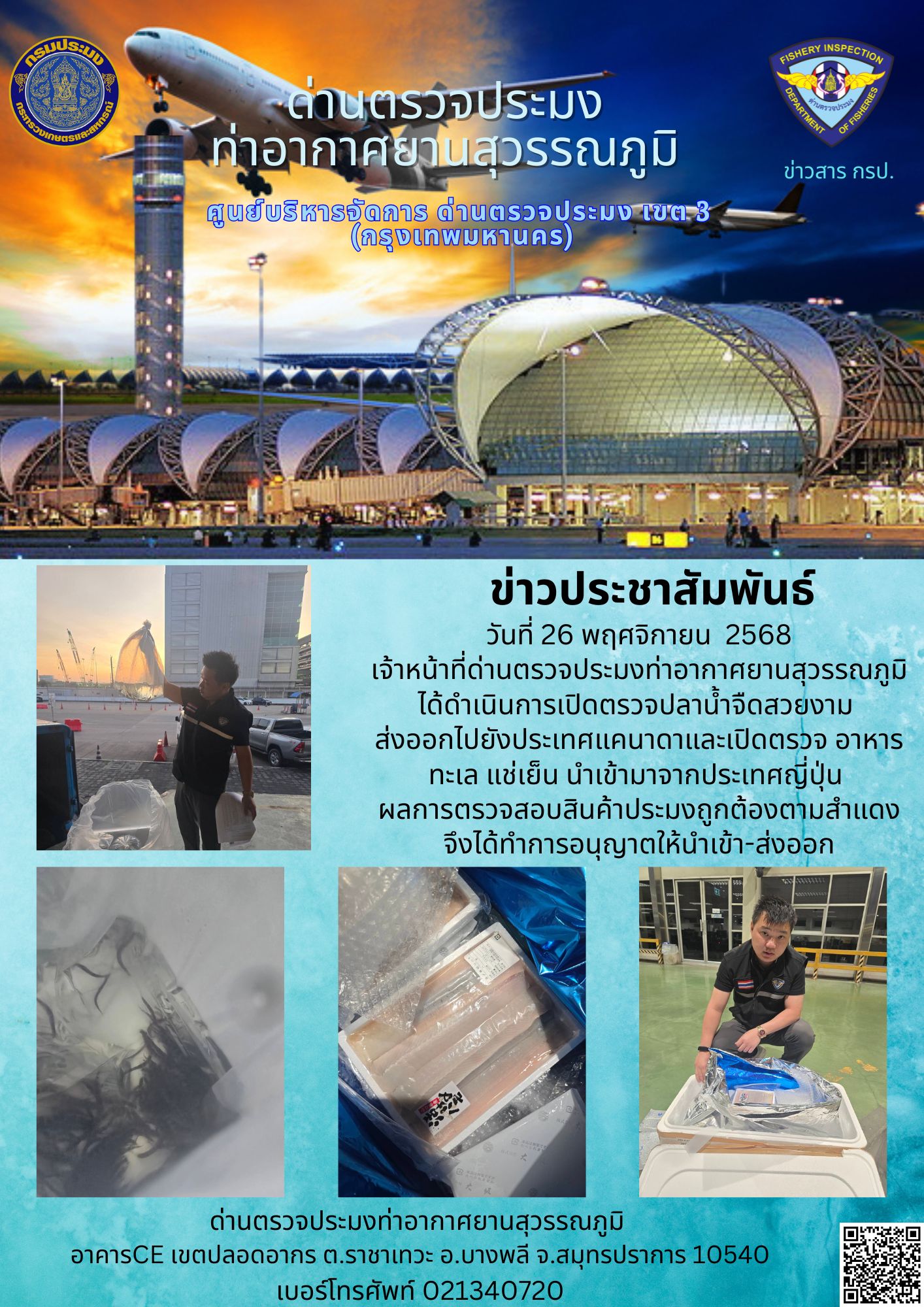 วันที่ 26 พฤศจิกายน 2568 เจ้าหน้าที่ด่านตรวจประมงท่าอากาศยานสุวรรณภูมิ ได้ดำเนินการเปิดตรวจปลาน้ำจืดสวยงาม ส่งออกไปยังประเทศแคนาดาและเปิดตรวจ อาหารทะเล แช่เย็น นำเข้ามาจากประเทศญี่ปุ่น ผลการตรวจสอบสินค้าประมงถูกต้องตามสำแดง จึงได้ทำการอนุญาตให้นำเข้า-ส่งออก