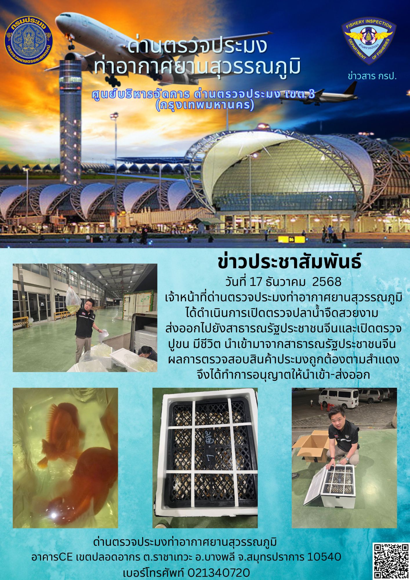 วันที่ 17 ธันวาคม 2568 เจ้าหน้าที่ด่านตรวจประมงท่าอากาศยานสุวรรณภูมิ ได้ดำเนินการเปิดตรวจปลาน้ำจืดสวยงาม ส่งออกไปยังสาธารณรัฐประชาชนจีนและเปิดตรวจ ปูขน มีชีวิต นำเข้ามาจากสาธารณรัฐประชาชนจีน ผลการตรวจสอบสินค้าประมงถูกต้องตามสำแดง จึงได้ทำการอนุญาตให้นำเข้า-ส่งออก