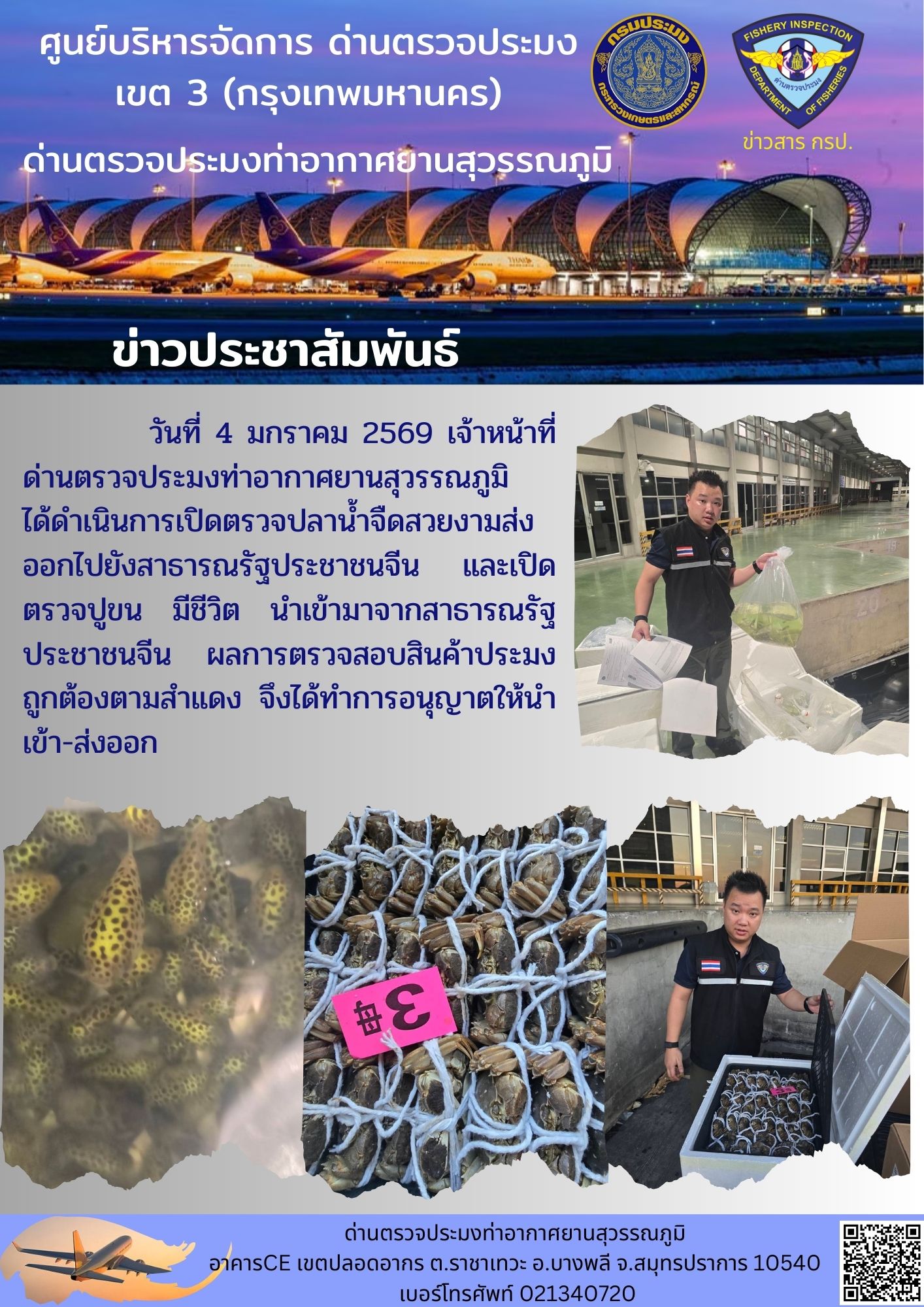 วันที่ 4 มกราคม 2569 เจ้าหน้าที่ด่านตรวจประมงท่าอากาศยานสุวรรณภูมิ ได้ดำเนินการเปิดตรวจปลาน้ำจืดสวยงามส่งออกไปยังสาธารณรัฐประชาชนจีน และเปิดตรวจปูขน มีชีวิต นำเข้ามาจากสาธารณรัฐประชาชนจีน ผลการตรวจสอบสินค้าประมงถูกต้องตามสำแดง จึงได้ทำการอนุญาตให้นำเข้า-ส่งออก