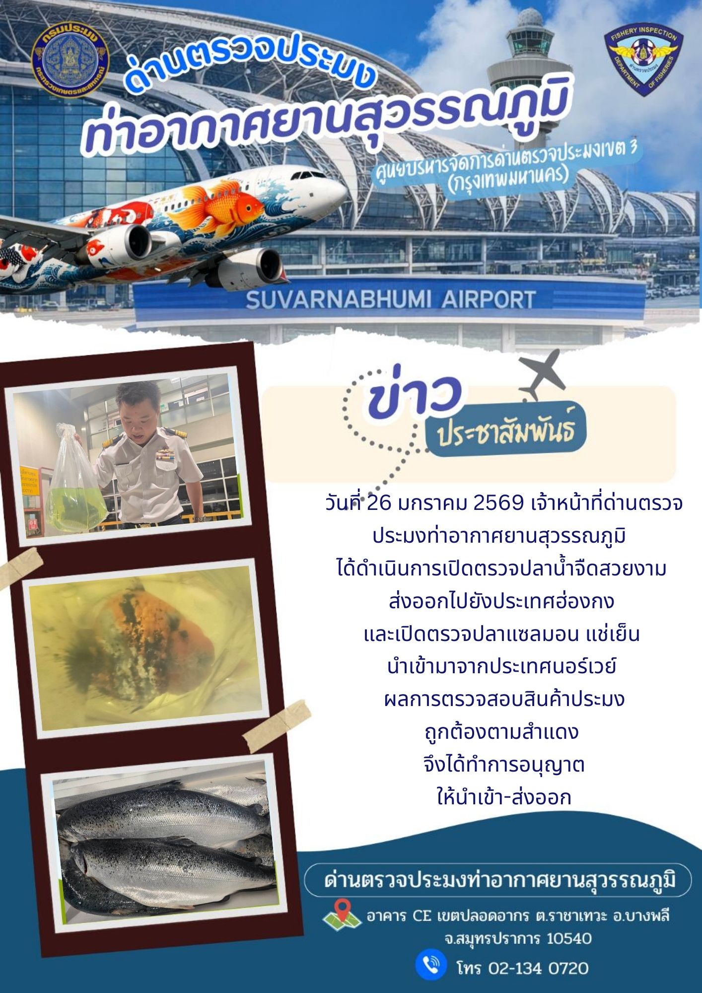 วันที่ 26 มกราคม 2569 เจ้าหน้าที่ด่านตรวจประมงท่าอากาศยานสุวรรณภูมิ ได้ดำเนินการเปิดตรวจปลาน้ำจืดสวยงาม ส่งออกไปยังประเทศฮ่องกง และเปิดตรวจปลาแซลมอน แช่เย็น นำเข้ามาจากประเทศนอร์เวย์ผลการตรวจสอบสินค้าประมง ถูกต้องตามสำแดงจึงได้ทำการอนุญาต ให้นำเข้า-ส่งออก