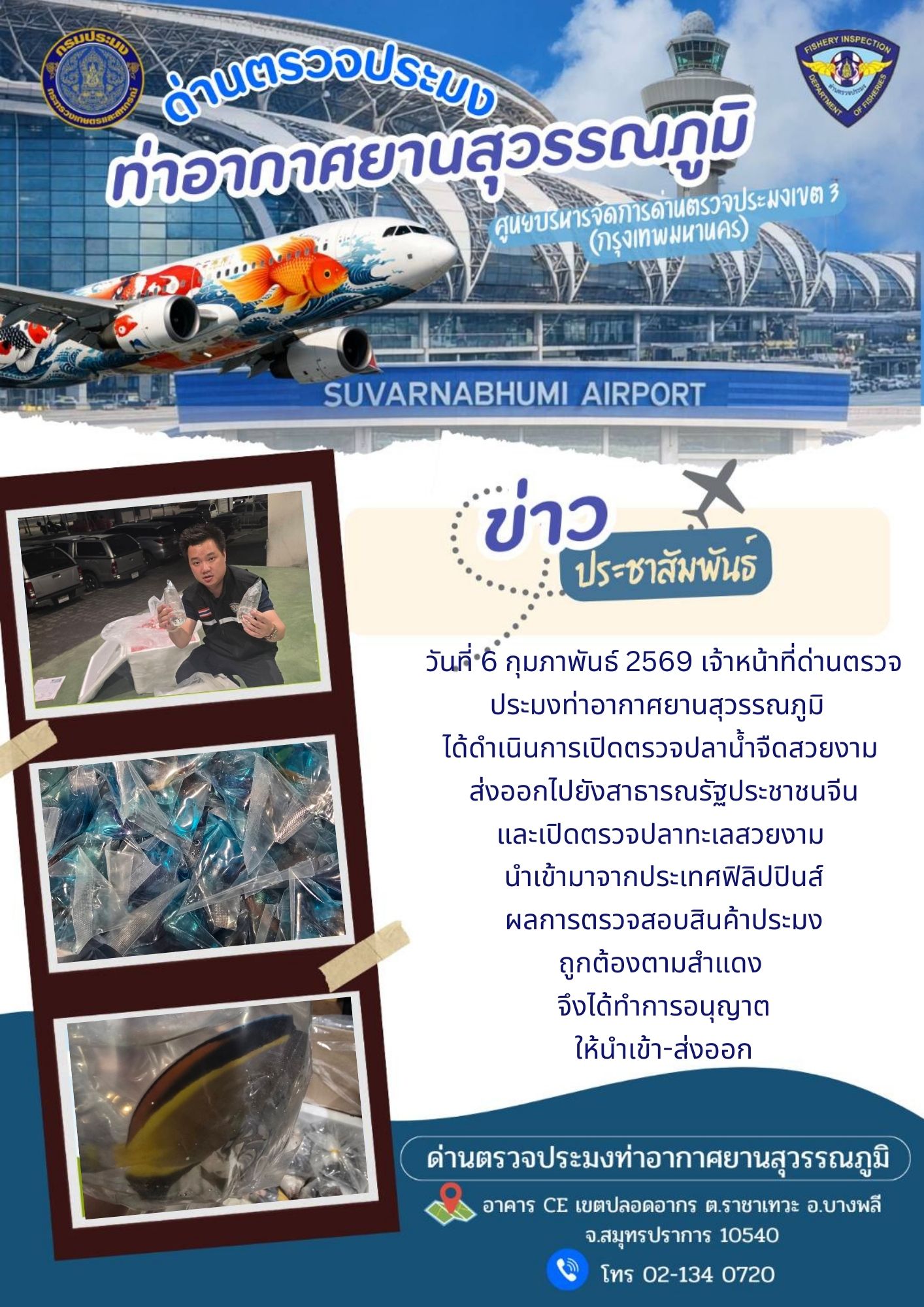 วันที่ 6 กุมภาพันธ์ 2569 เจ้าหน้าที่ด่านตรวจประมงท่าอากาศยานสุวรรณภูมิได้ดำเนินการเปิดตรวจปลาน้ำจืดสวยงามส่งออกไปยังสาธารณรัฐประชาชนจีนและเปิดปลาทะเลสวยงาม