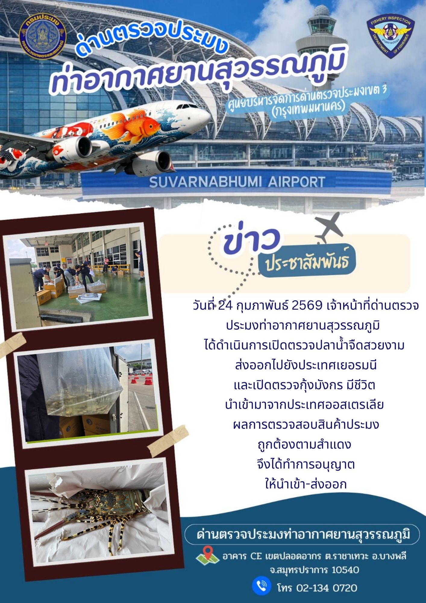 วันที่ 24 กุมภาพันธ์ 2569 เจ้าหน้าที่ด่านตรวจประมงท่าอากาศยานสุวรรณภูมิ ได้ดำเนินการเปิดตรวจปลาน้ำจืดสวยงาม ส่งออกไปยังประเทศเยอรมนี และเปิดตรวจกุ้งมังกร มีชีวิต นำเข้ามาจากประเทศออสเตรเลีย ผลการตรวจสอบสินค้าประมง ถูกต้องตามสำแดง จึงได้ทำการอนุญาต ให้นำเข้า-ส่งออก