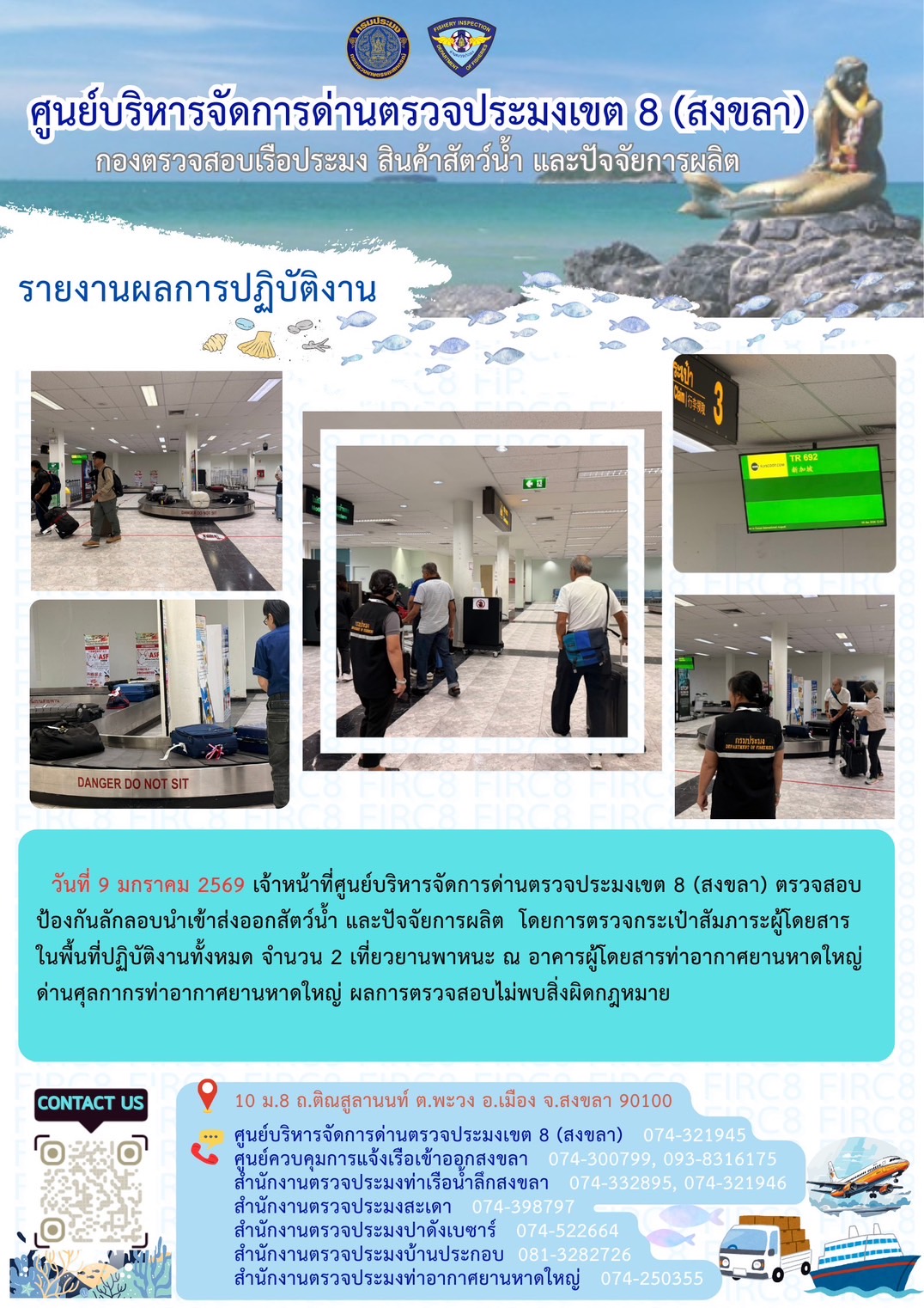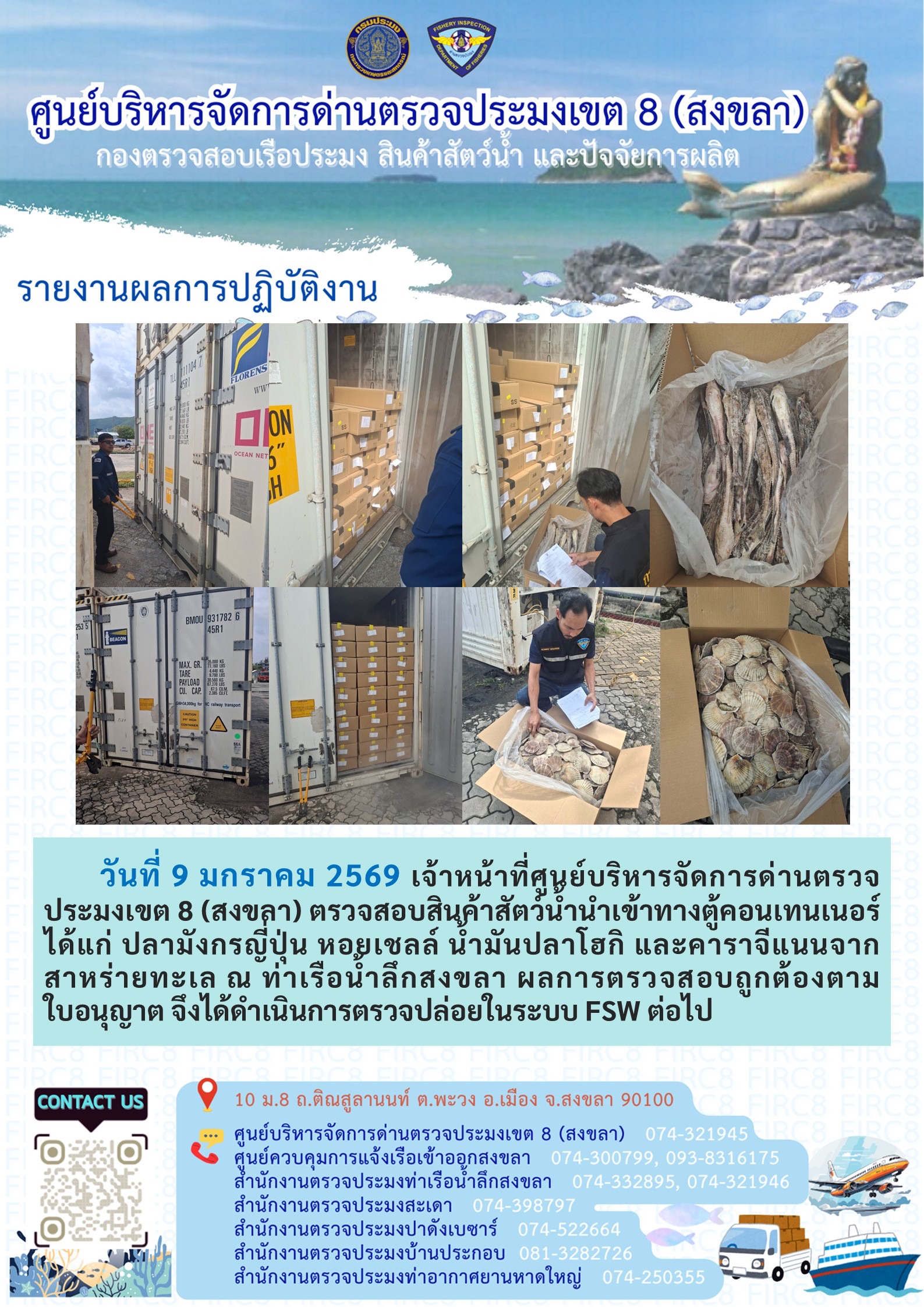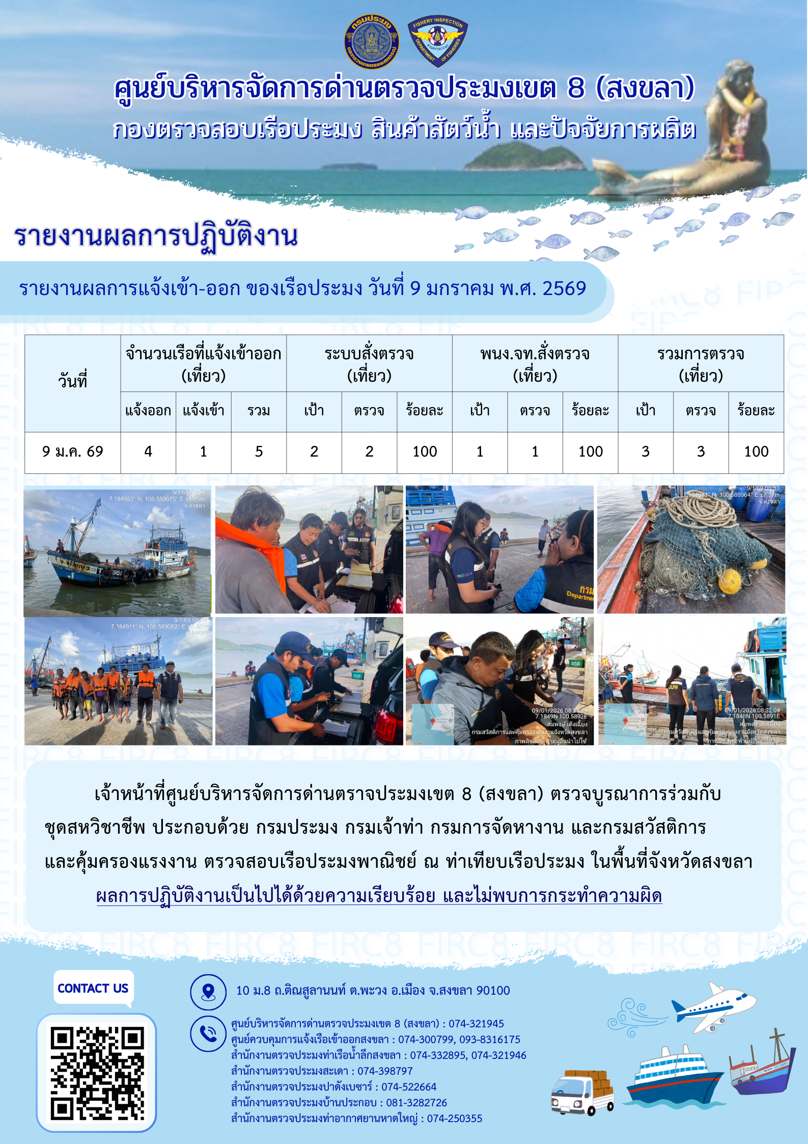 ผลการปฏิบัติงานศูนย์บริหารจัดการด่านตรวจประมงเขต 8 (สงขลา) ประจำวันที่ 9 มกราคม 2569