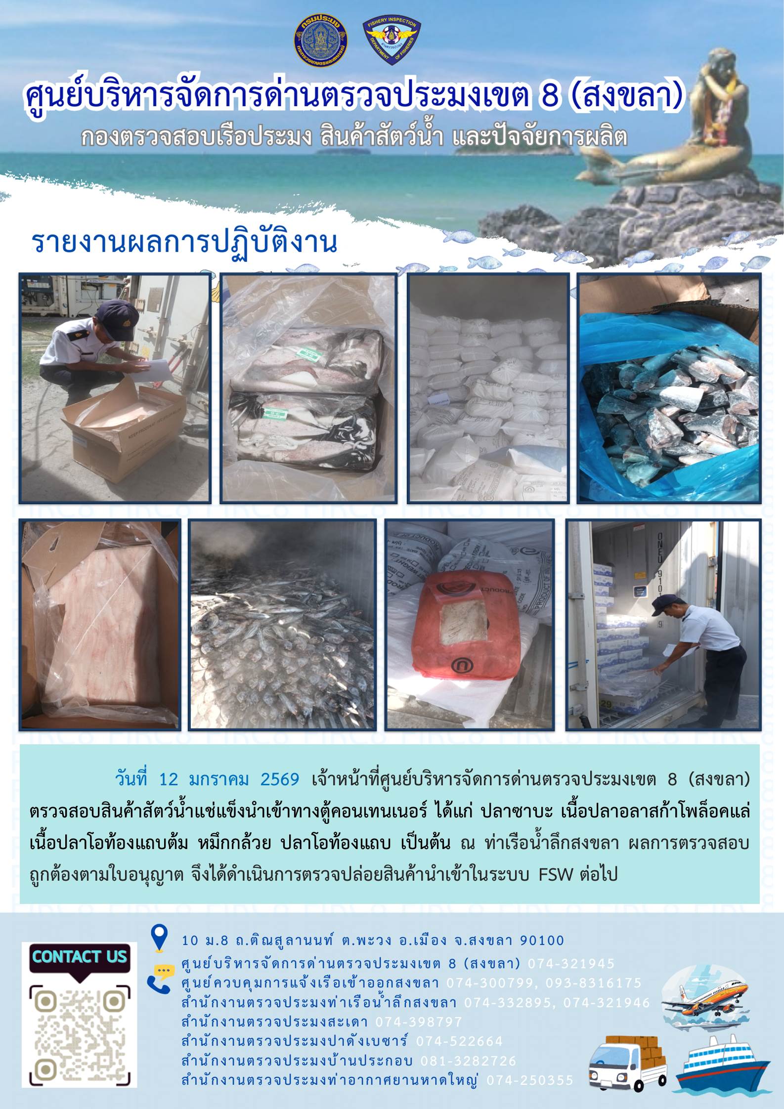 ผลการปฏิบัติงานศูนย์บริหารจัดการด่านตรวจประมงเขต 8 (สงขลา) ประจำวันที่ 12 มกราคม 2569