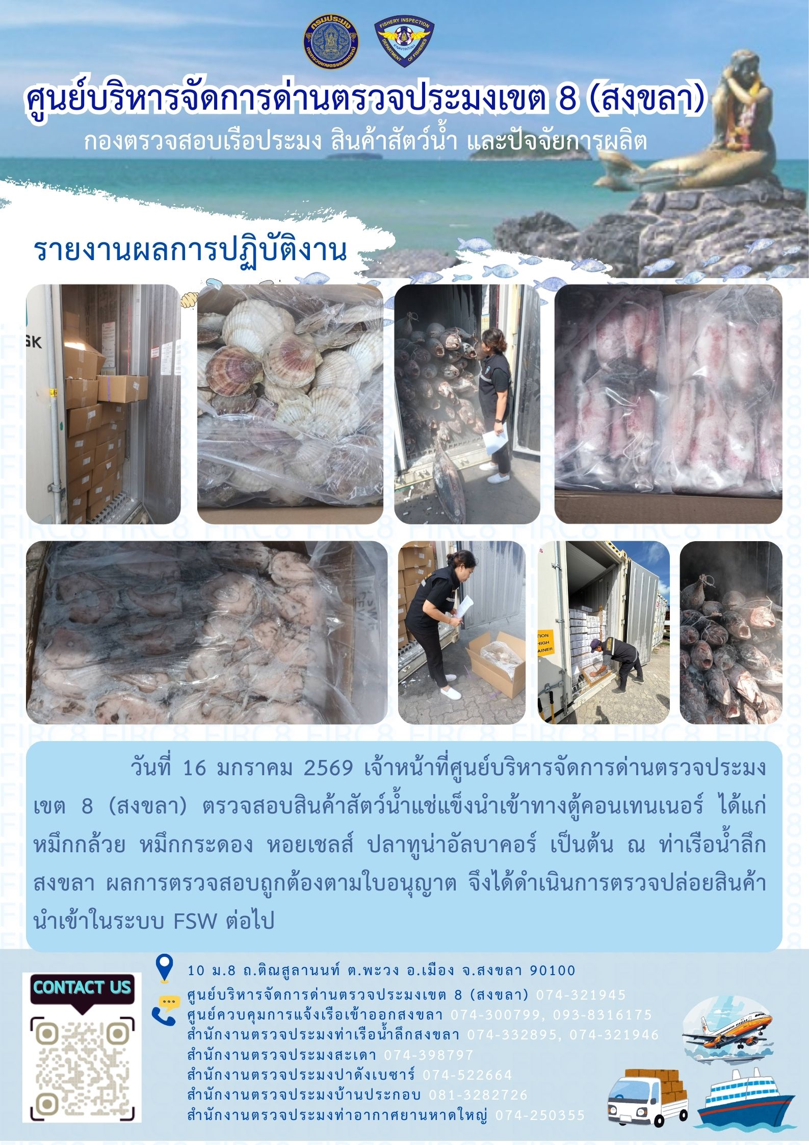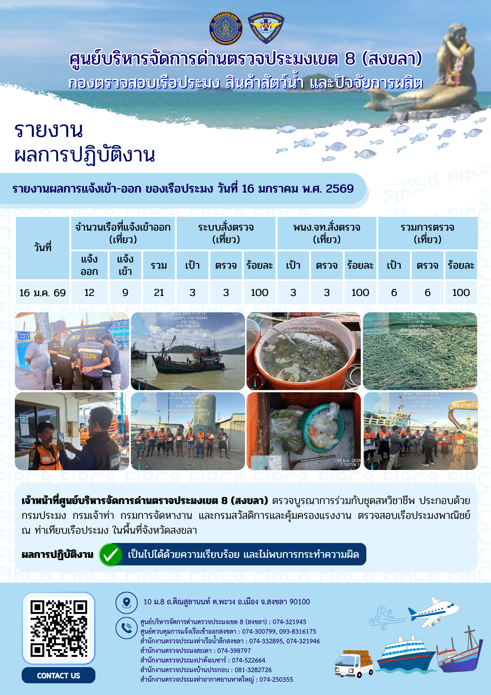 ผลการปฏิบัติงานศูนย์บริหารจัดการด่านตรวจประมงเขต 8 (สงขลา) ประจำวันที่ 16 มกราคม 2569