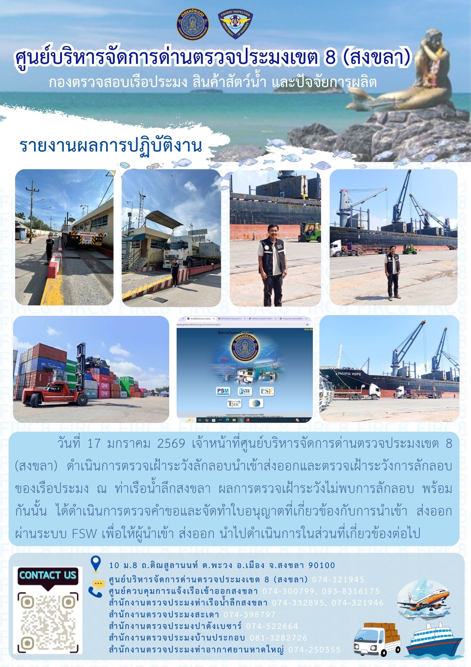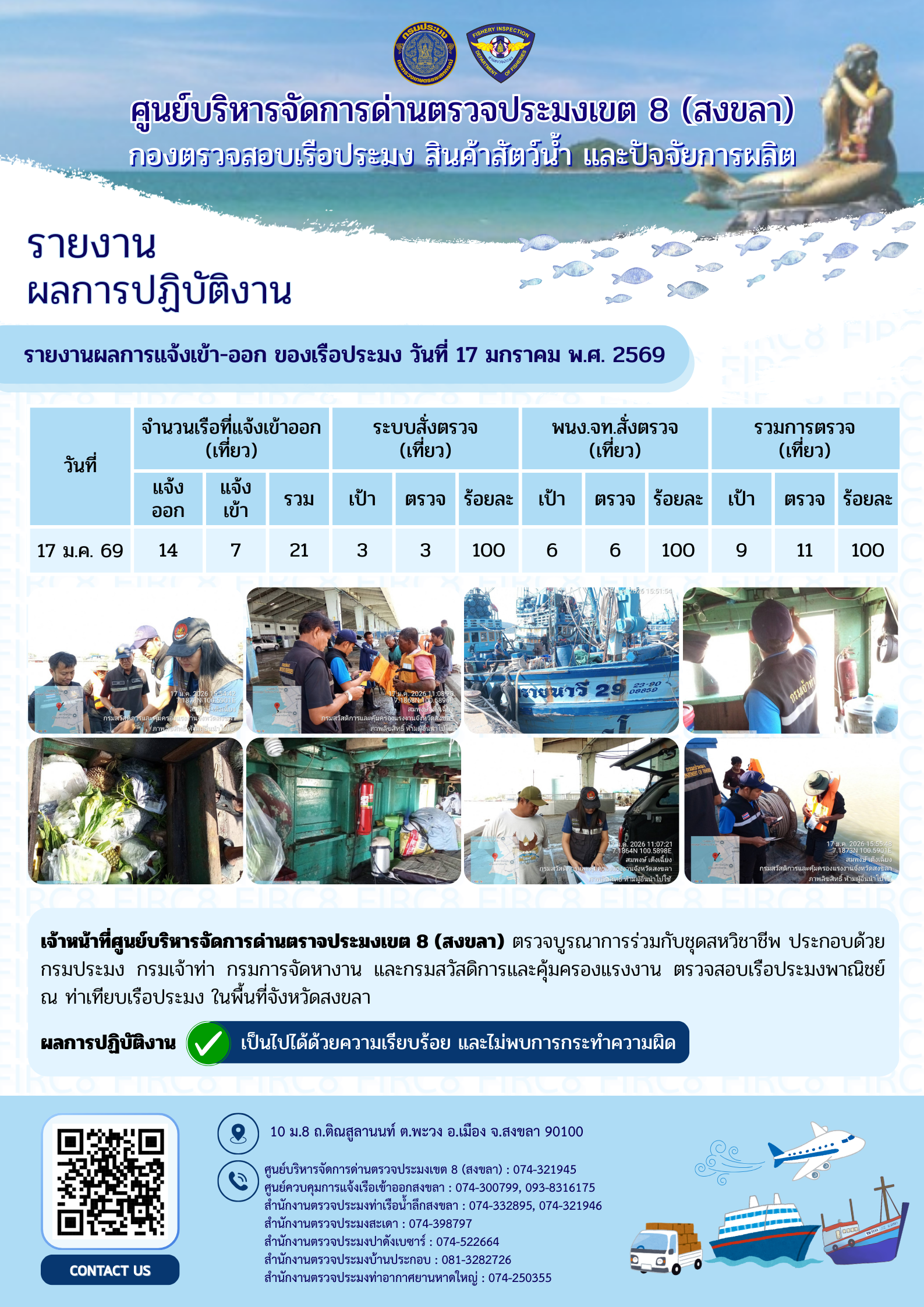 ผลการปฏิบัติงานศูนย์บริหารจัดการด่านตรวจประมงเขต 8 (สงขลา) ประจำวันที่ 17 มกราคม 2569