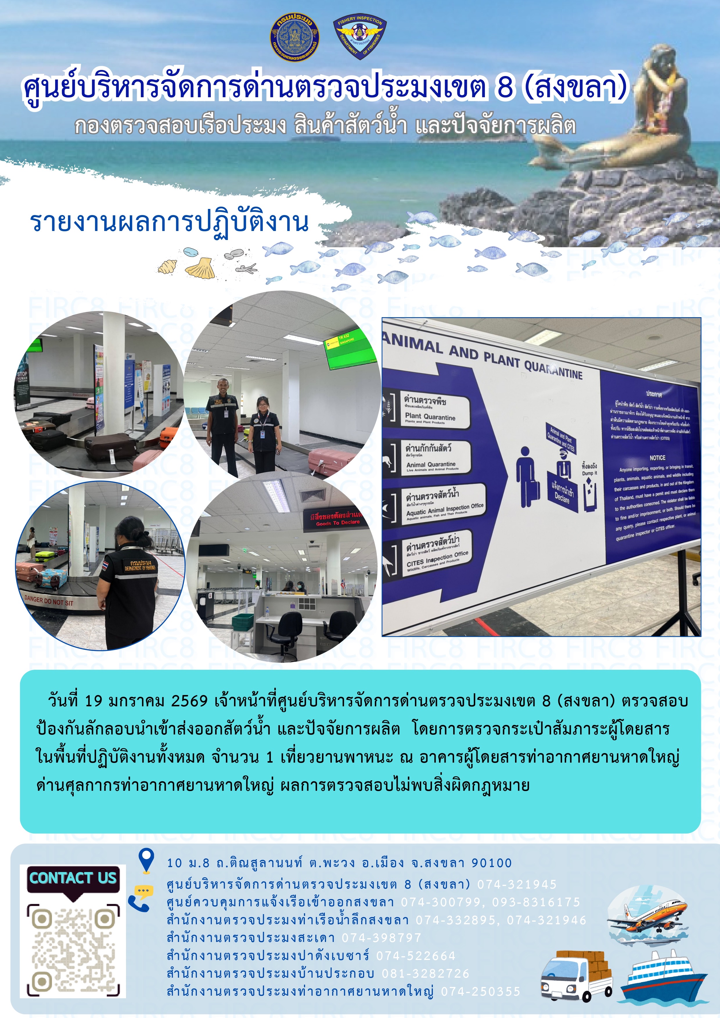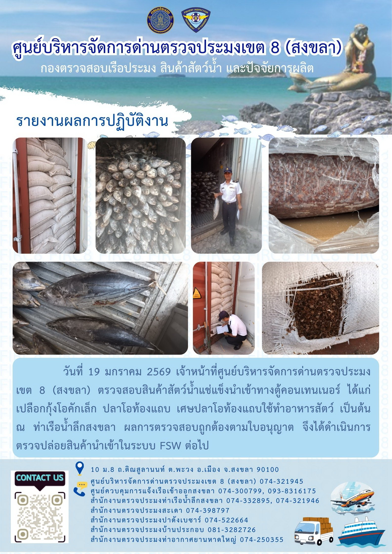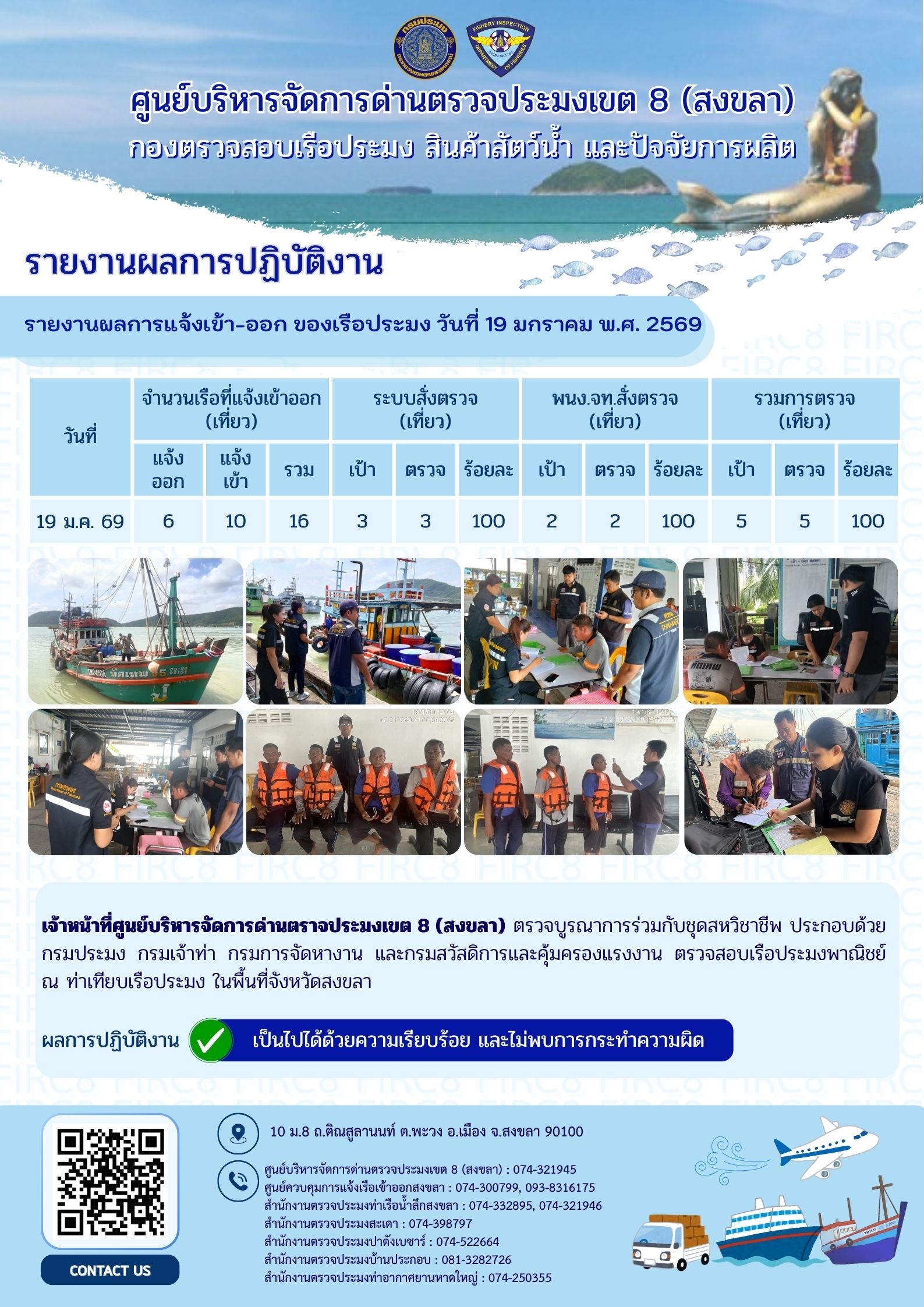 ผลการปฏิบัติงานศูนย์บริหารจัดการด่านตรวจประมงเขต 8 (สงขลา) ประจำวันที่ 19 มกราคม 2569