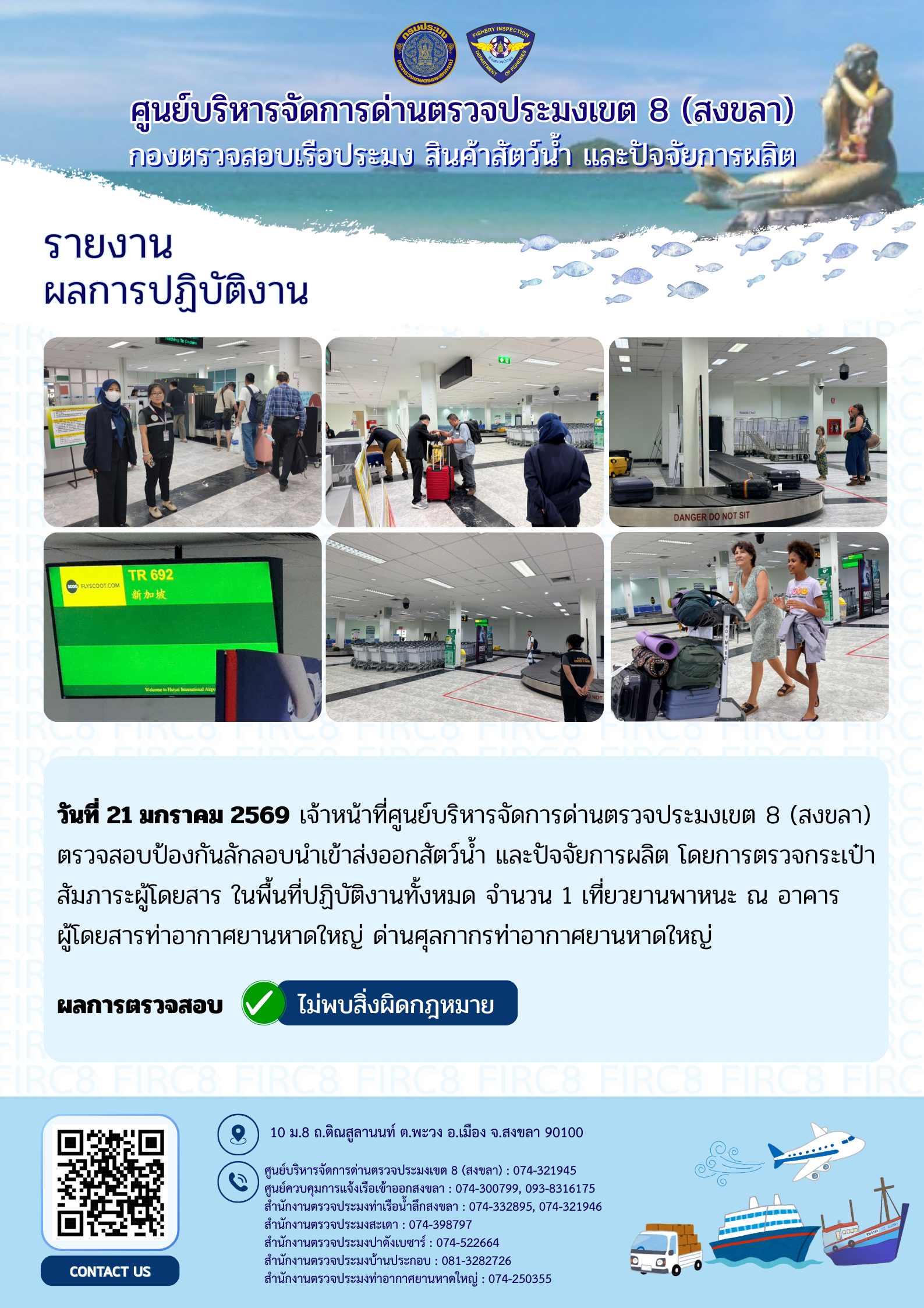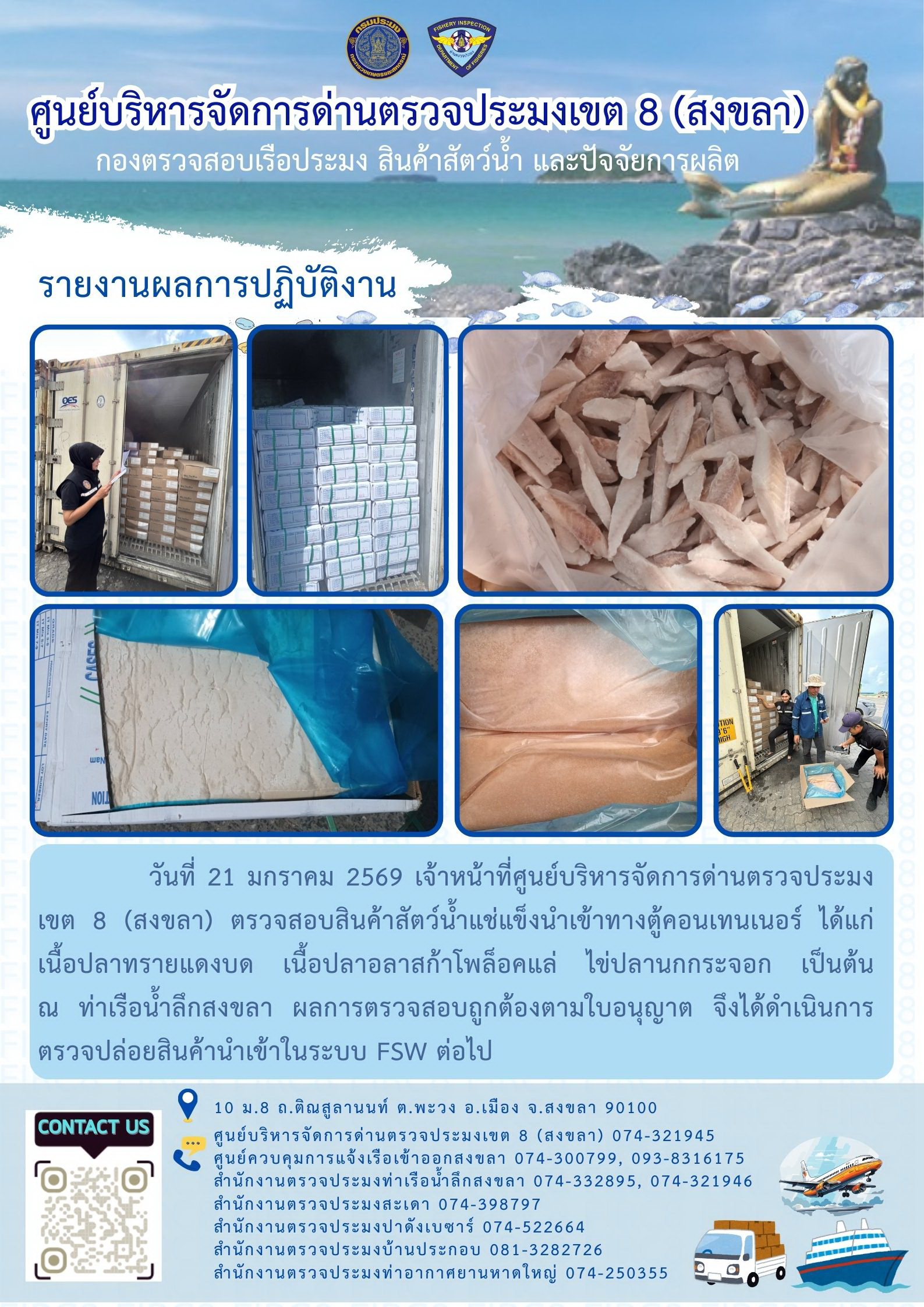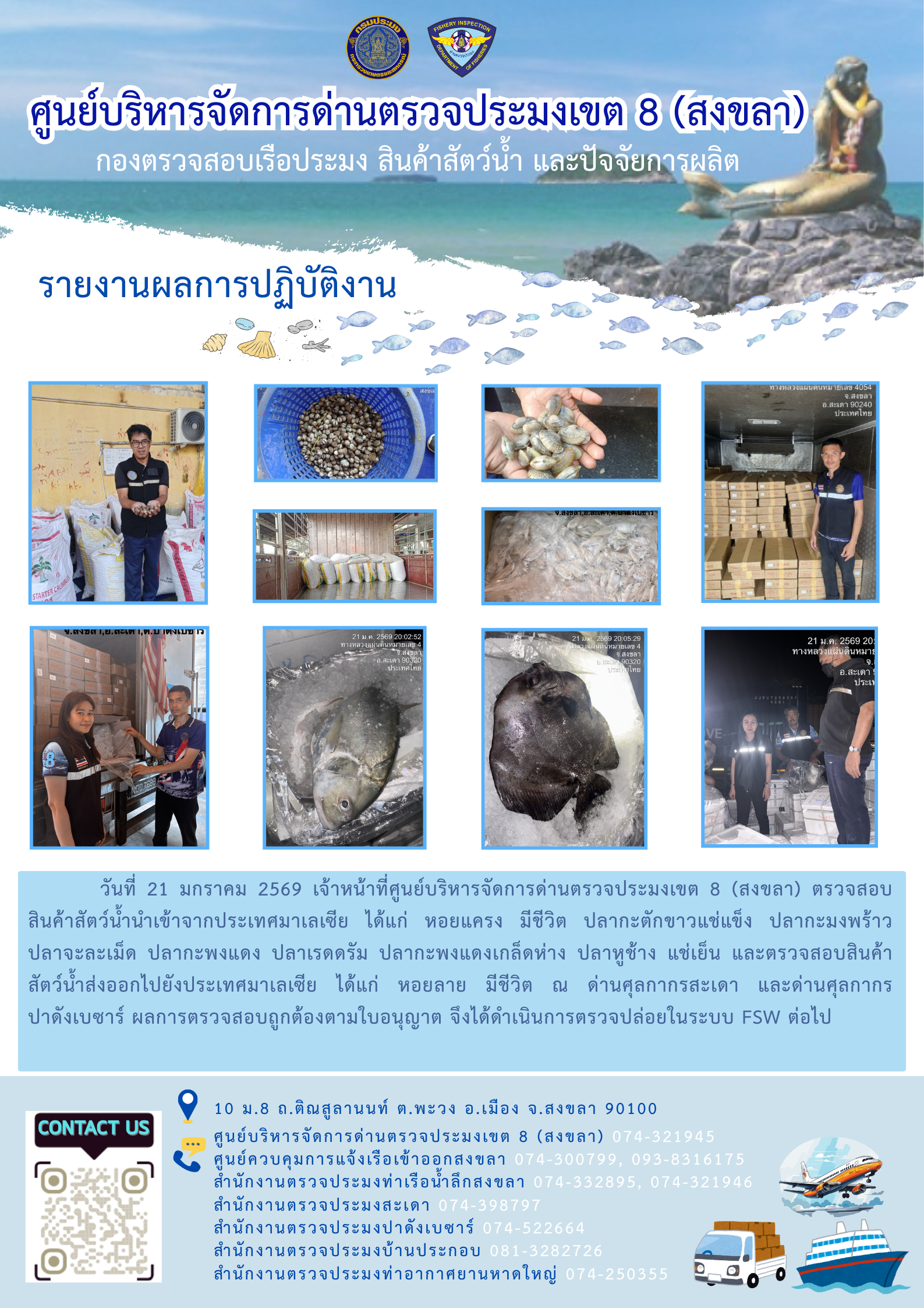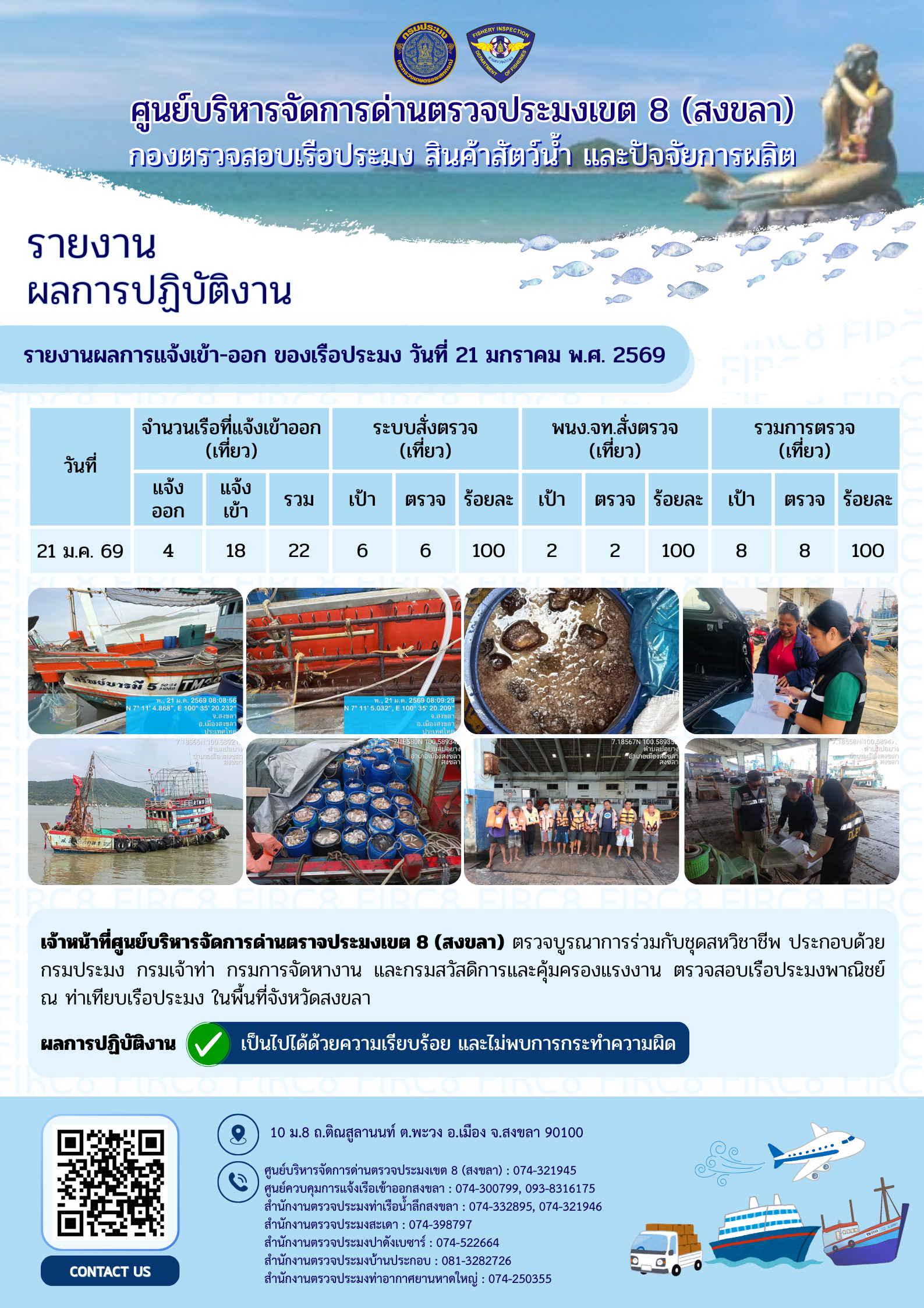 ผลการปฏิบัติงานศูนย์บริหารจัดการด่านตรวจประมงเขต 8 (สงขลา) ประจำวันที่ 21 มกราคม 2569