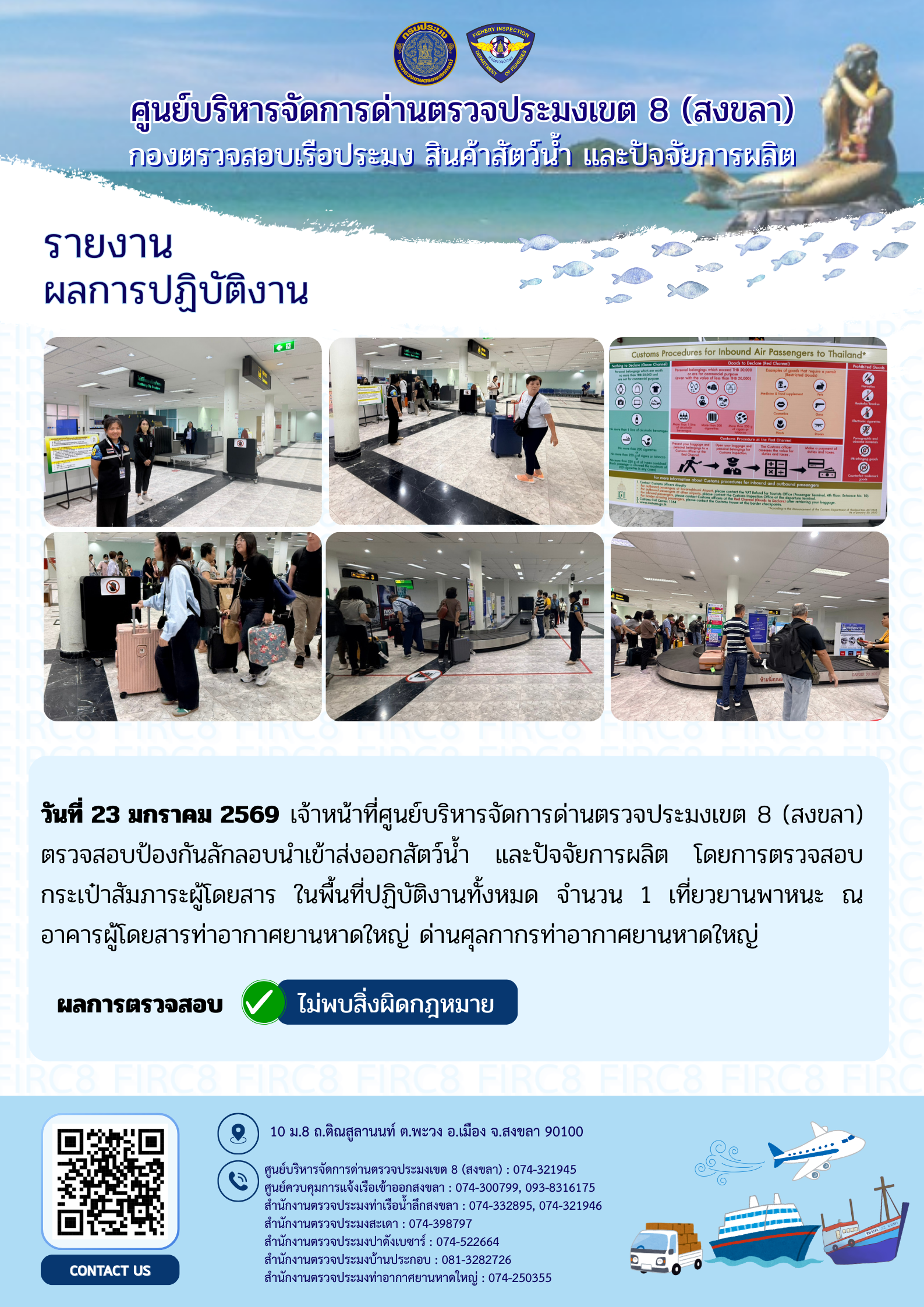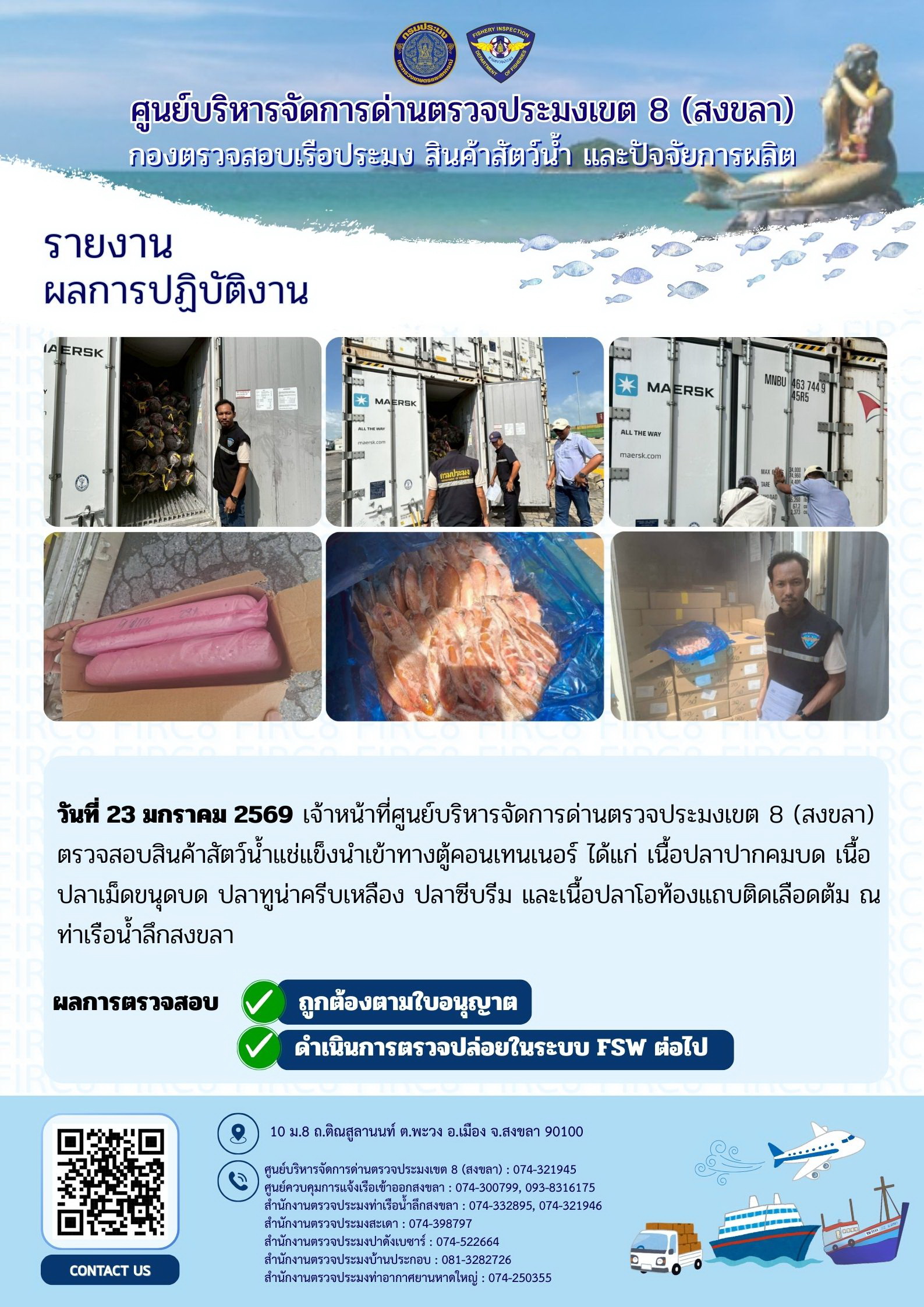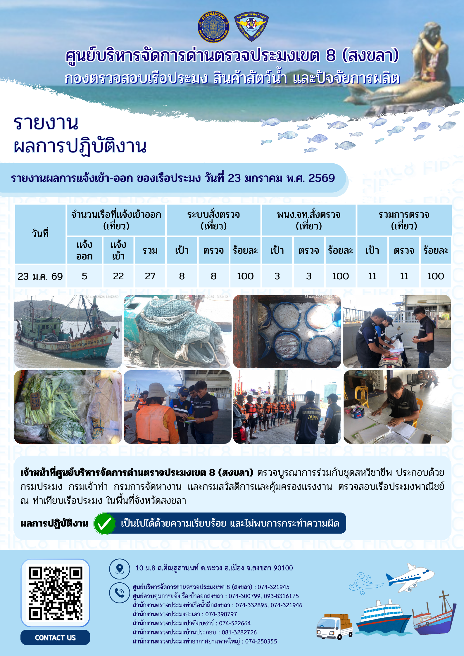 ผลการปฏิบัติงานศูนย์บริหารจัดการด่านตรวจประมงเขต 8 (สงขลา) ประจำวันที่ 23 มกราคม 2569