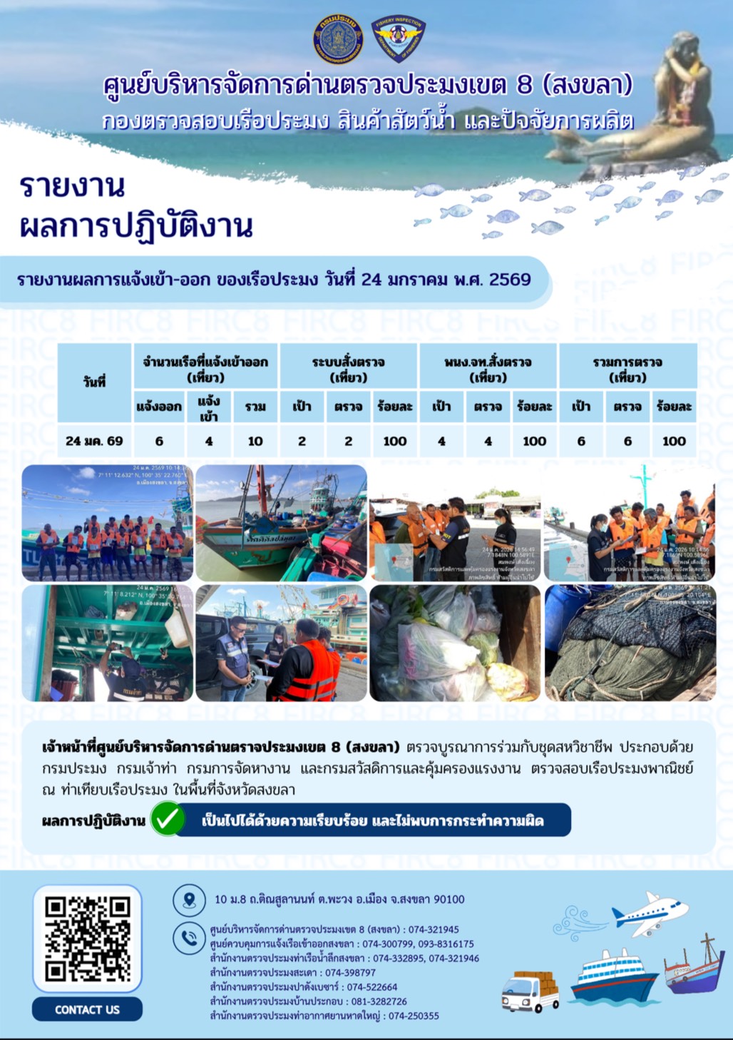 ผลการปฏิบัติงานศูนย์บริหารจัดการด่านตรวจประมงเขต 8 (สงขลา) ประจำวันที่ 24 มกราคม 2569