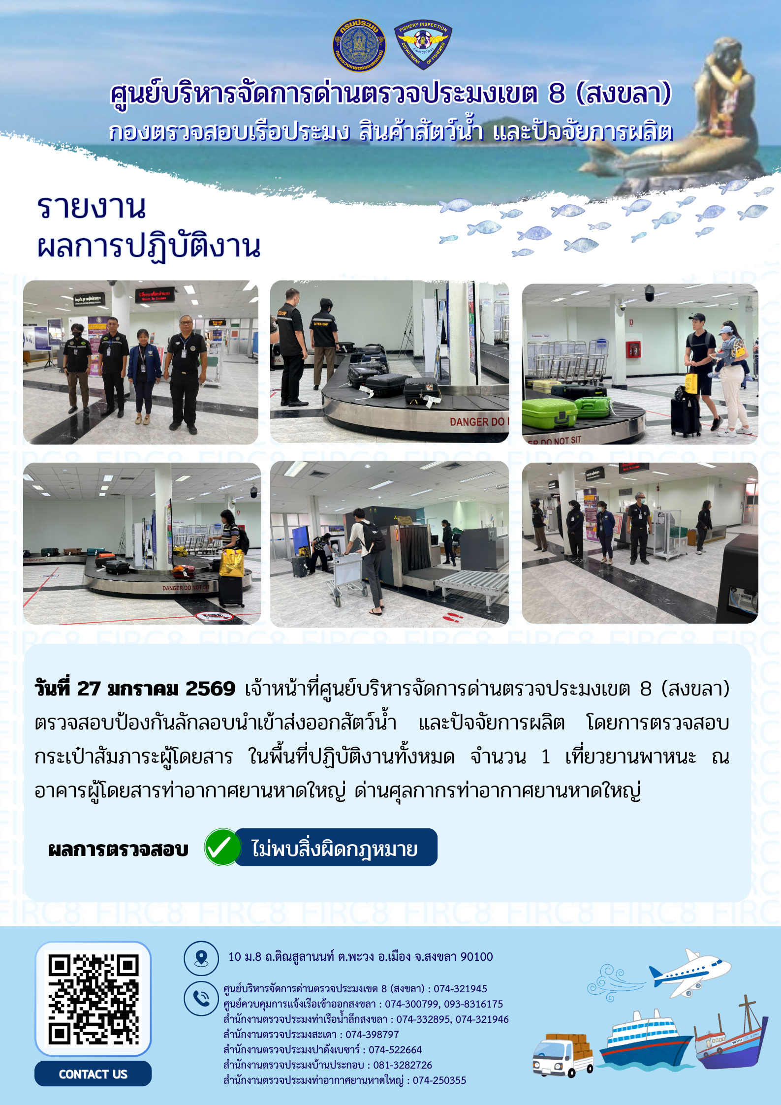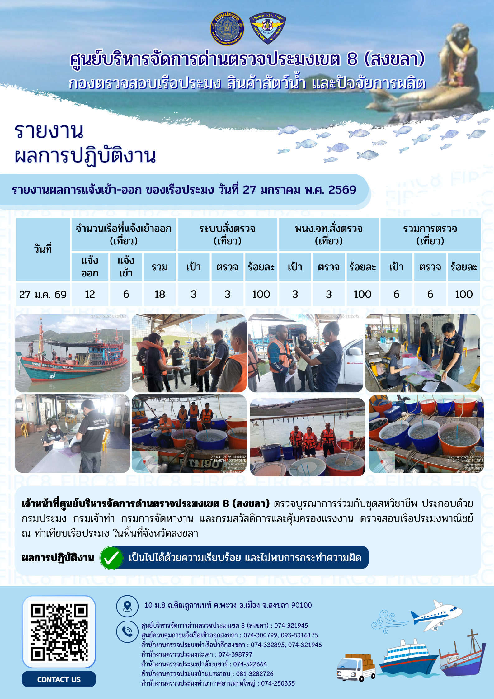 ผลการปฏิบัติงานศูนย์บริหารจัดการด่านตรวจประมงเขต 8 (สงขลา) ประจำวันที่ 27 มกราคม 2569