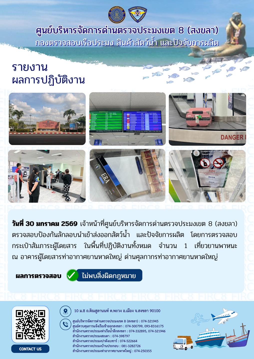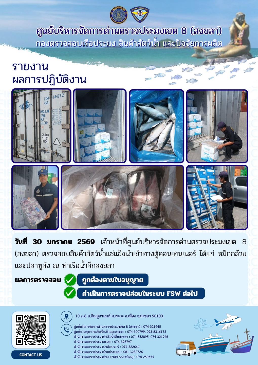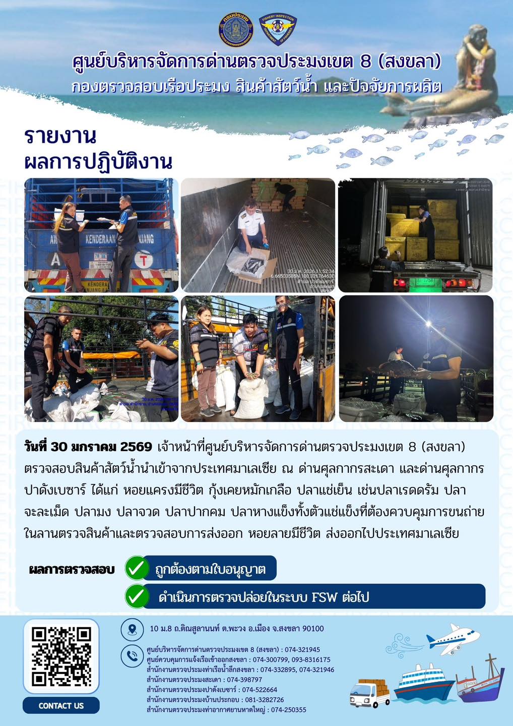 ผลการปฏิบัติงานศูนย์บริหารจัดการด่านตรวจประมงเขต 8 (สงขลา) ประจำวันที่ 30 มกราคม 2569