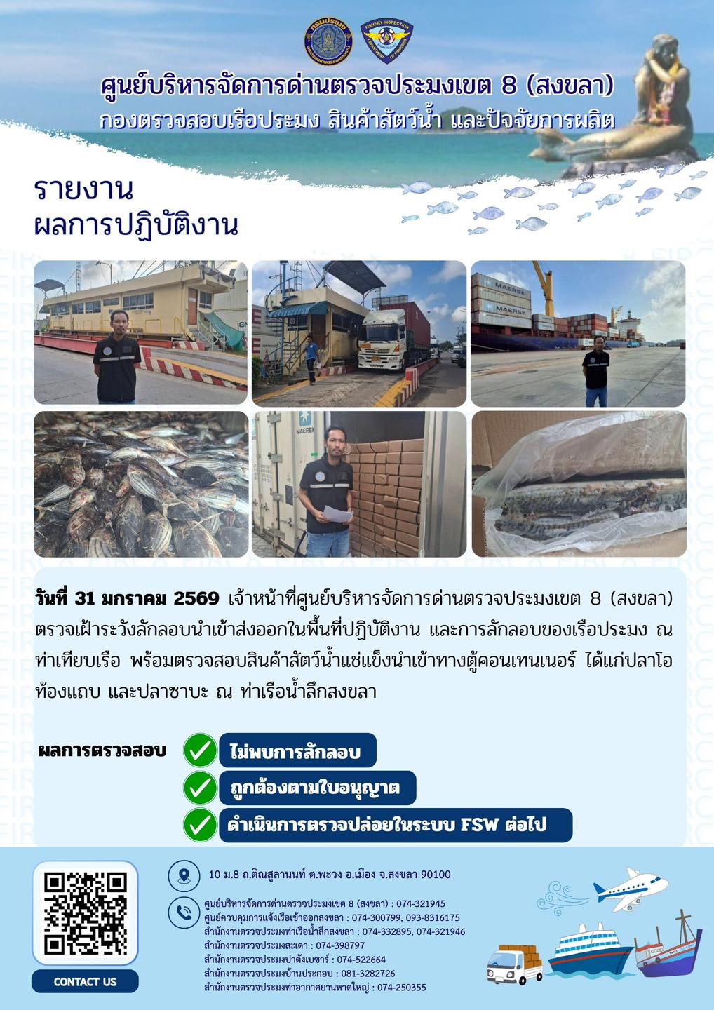 ผลการปฏิบัติงานศูนย์บริหารจัดการด่านตรวจประมงเขต 8 (สงขลา) ประจำวันที่ 31 มกราคม 2569