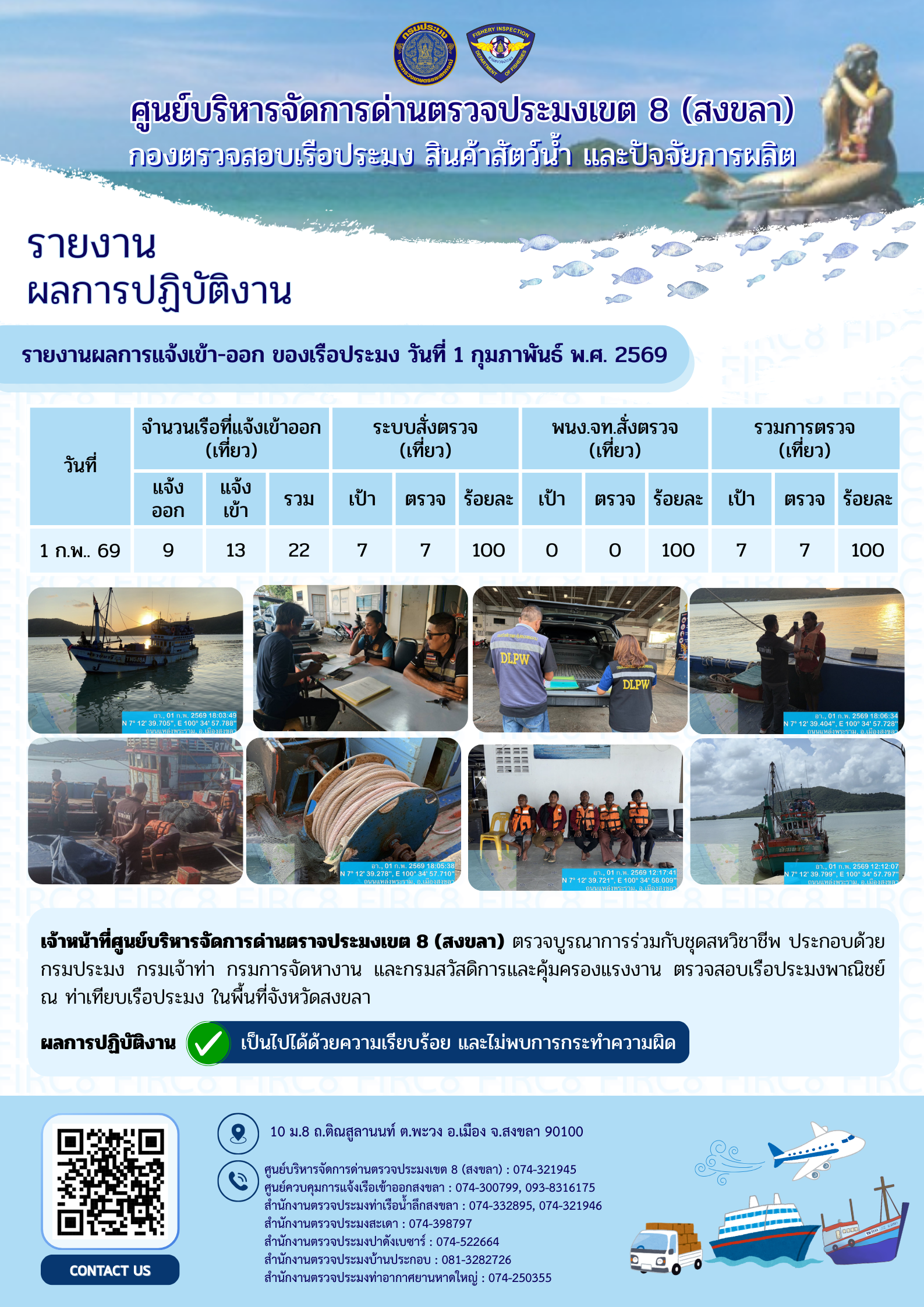 ผลการปฏิบัติงานศูนย์บริหารจัดการด่านตรวจประมงเขต 8 (สงขลา) ประจำวันที่ 1 กุมภาพันธ์ 2569