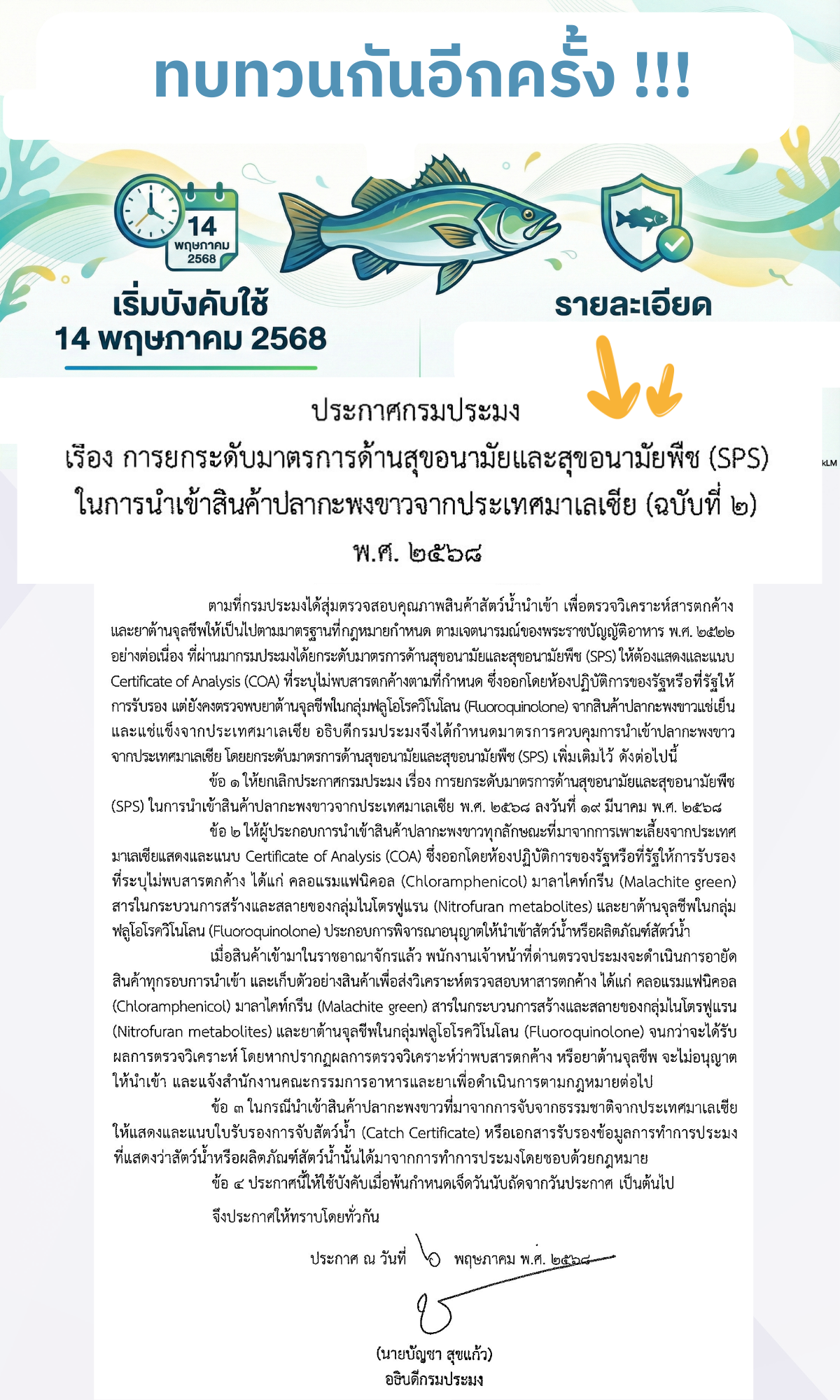 วันนี้ เรามาทบทวนประกาศกรมประมง เรื่อง การยกระดับมาตรการด้านสุขอนามัยและสุขอนามัยพืช (SPS) ในการนำเข้าสินค้า #ปลากะพงขาวจากประเทศมาเลเซีย (ฉบับที่ 2) พ.ศ. 2568