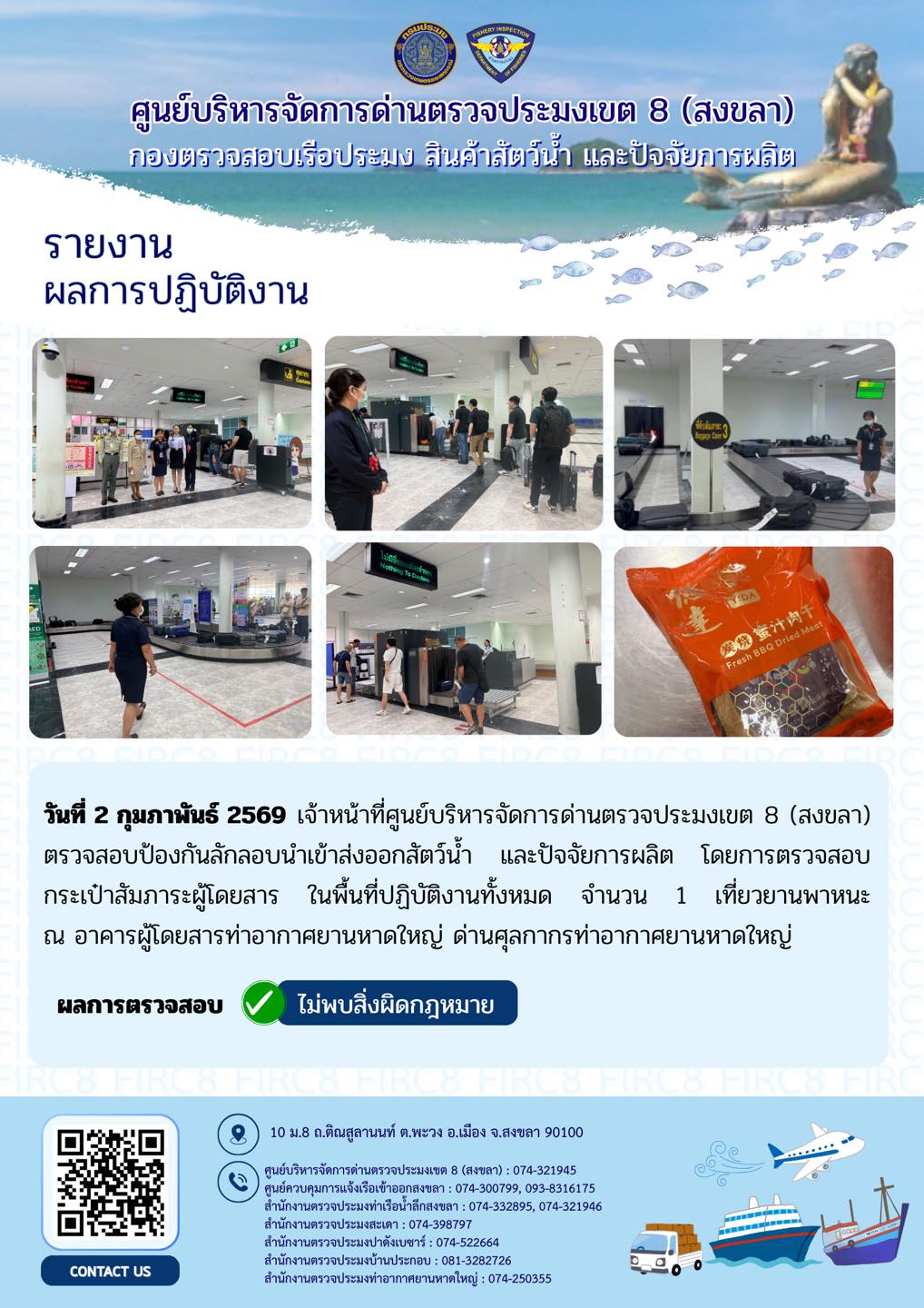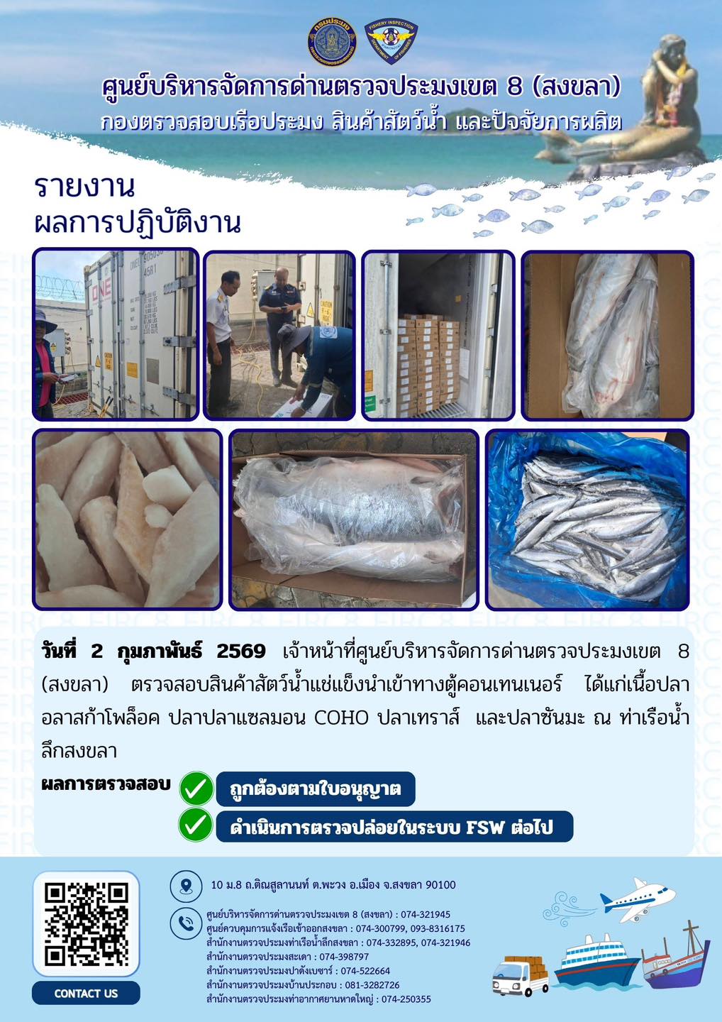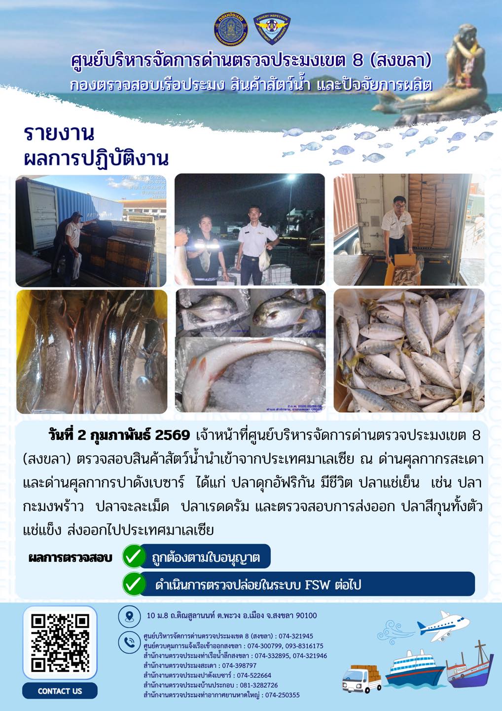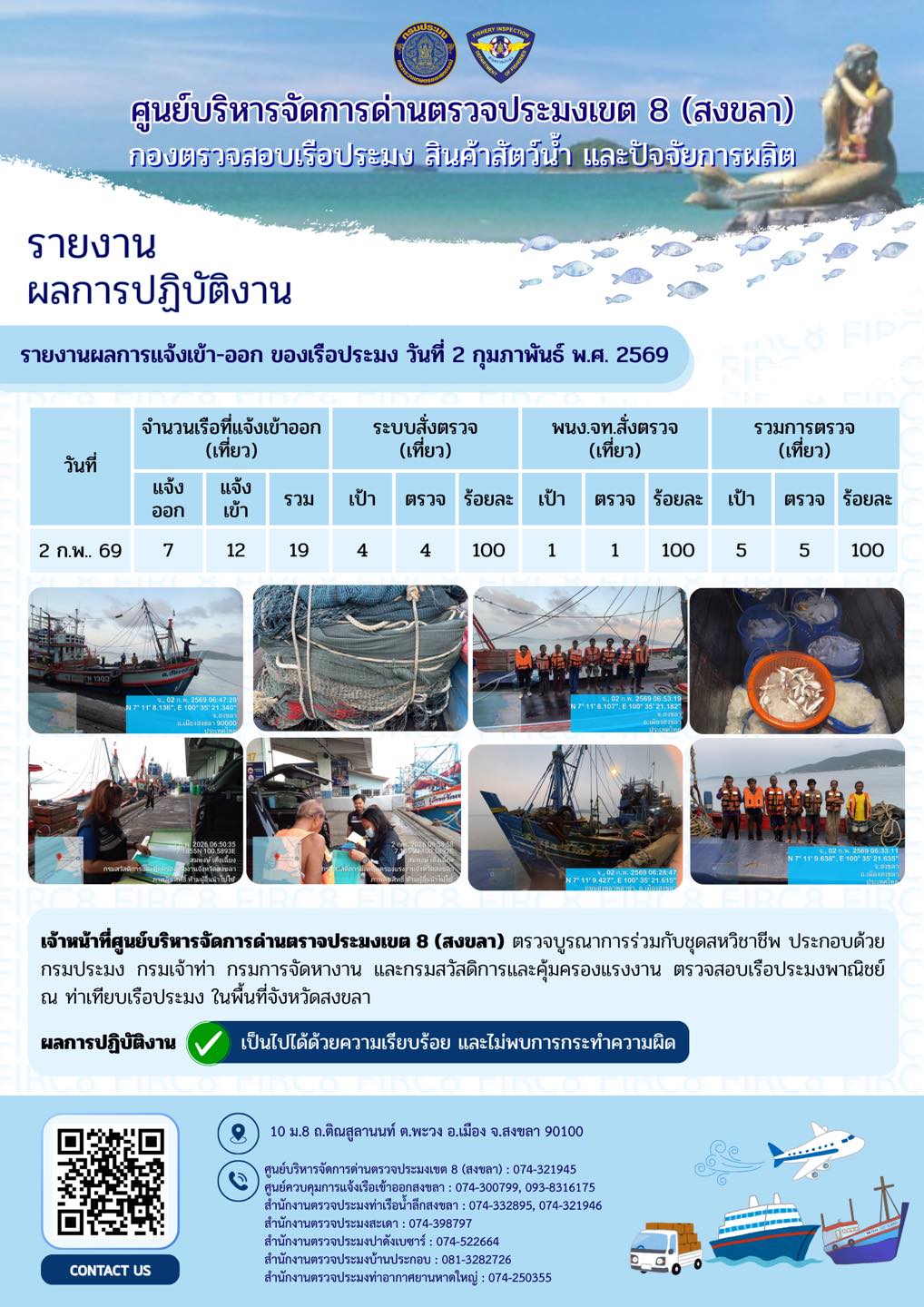 ผลการปฏิบัติงานศูนย์บริหารจัดการด่านตรวจประมงเขต 8 (สงขลา) ประจำวันที่ 2 กุมภาพันธ์ 2569