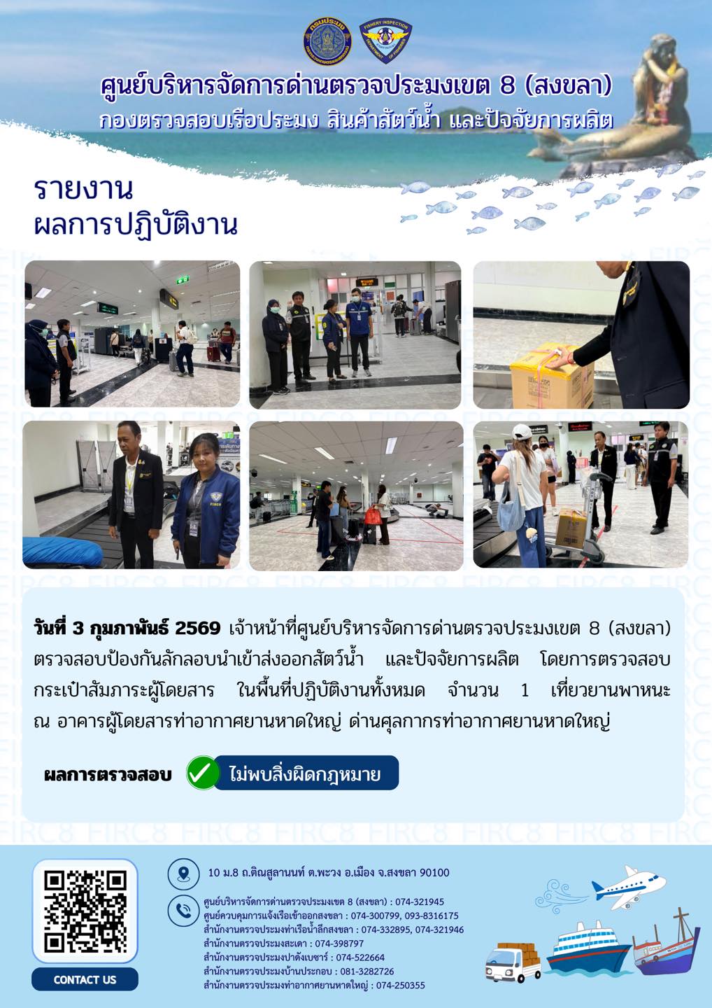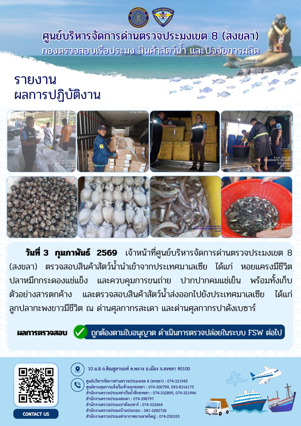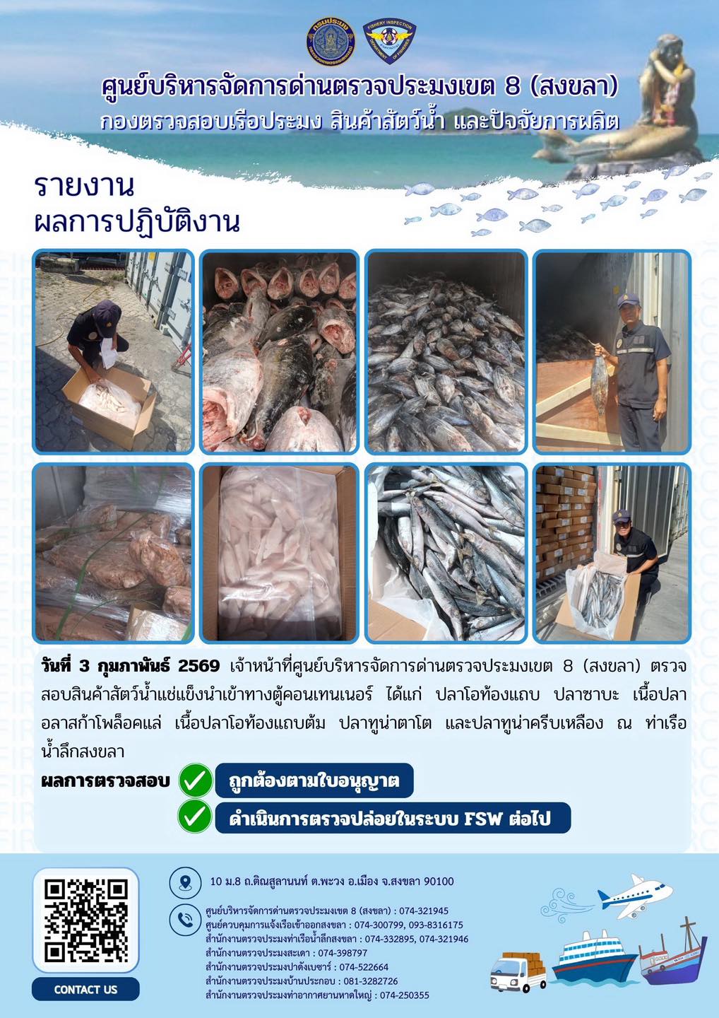 ผลการปฏิบัติงานศูนย์บริหารจัดการด่านตรวจประมงเขต 8 (สงขลา) ประจำวันที่ 3 กุมภาพันธ์ 2569