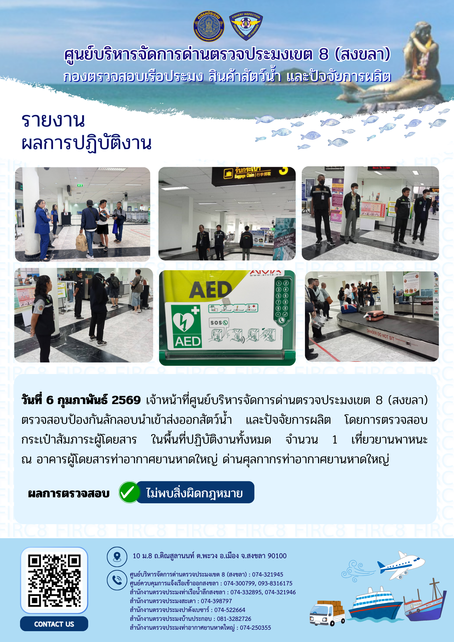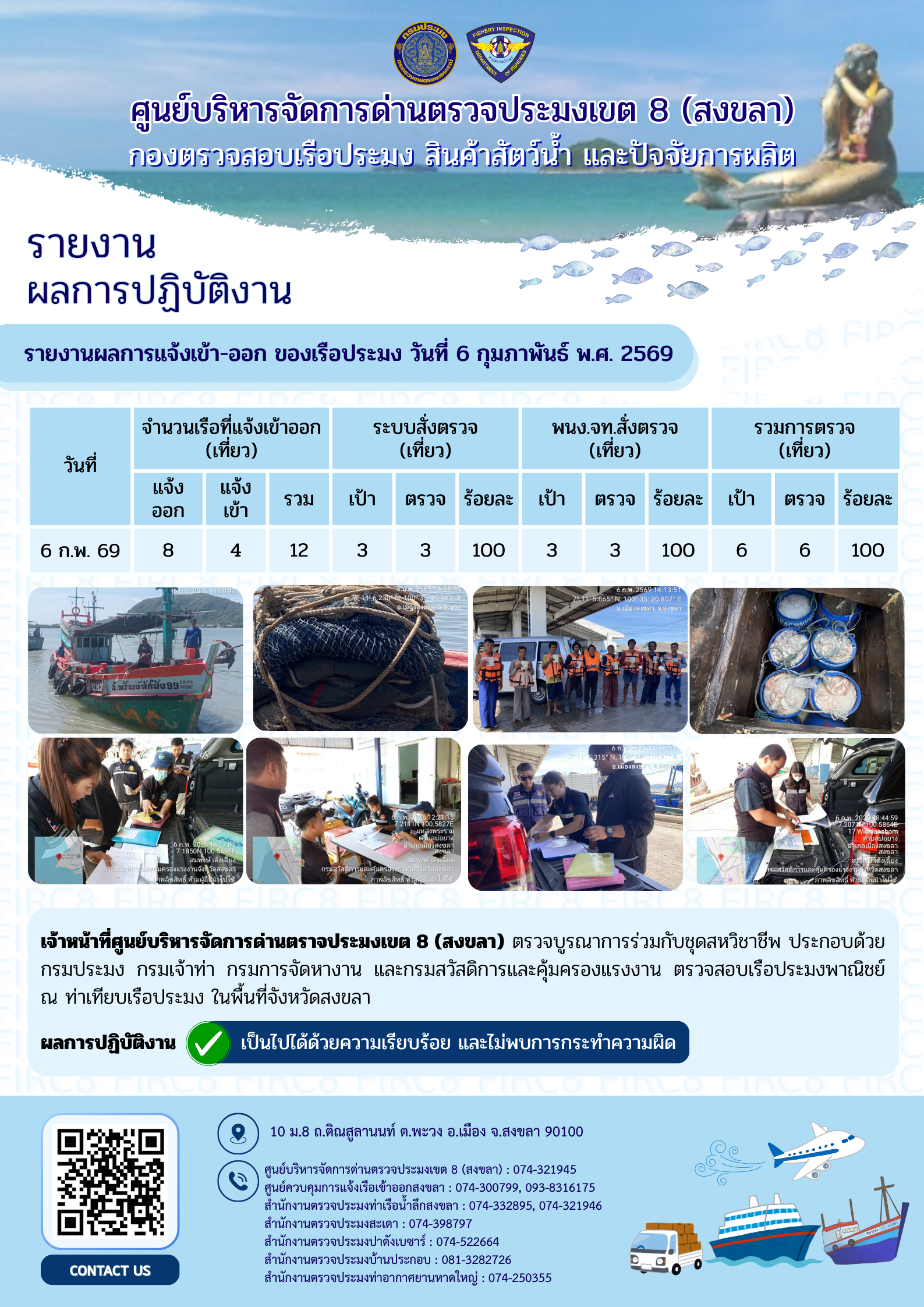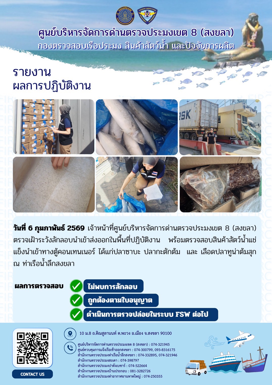 ผลการปฏิบัติงานศูนย์บริหารจัดการด่านตรวจประมงเขต 8 (สงขลา) ประจำวันที่ 6 กุมภาพันธ์ 2569