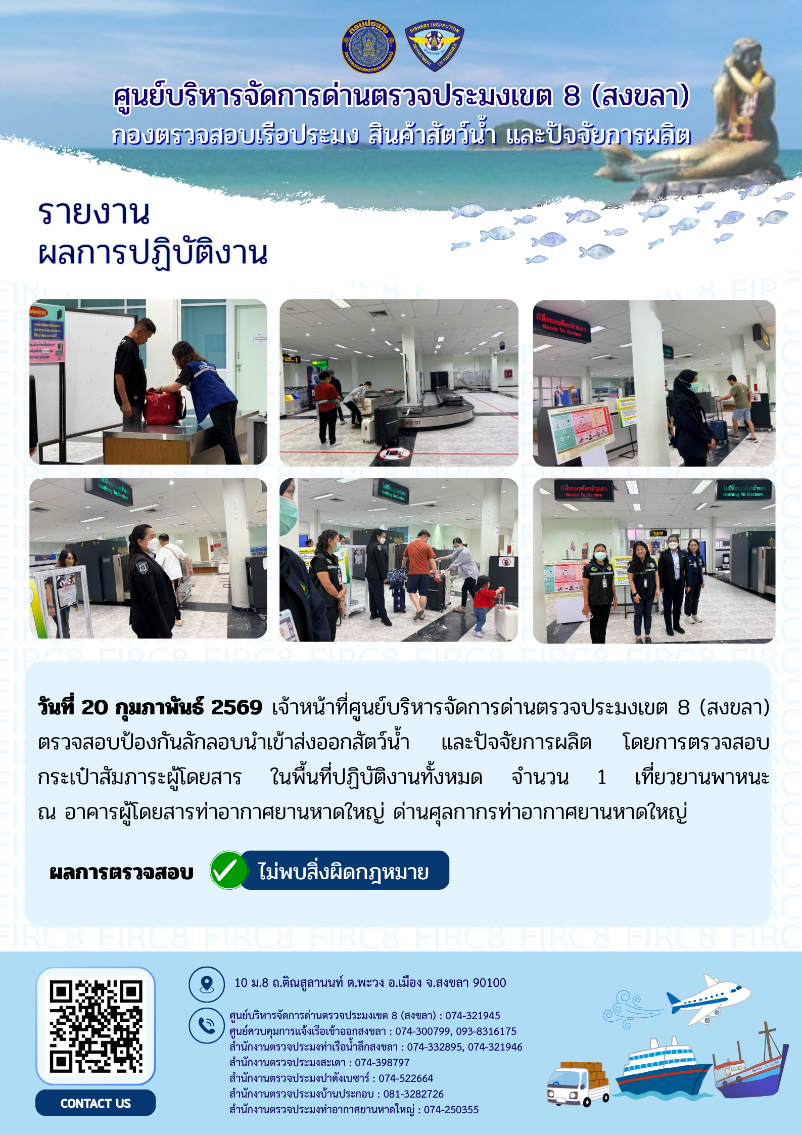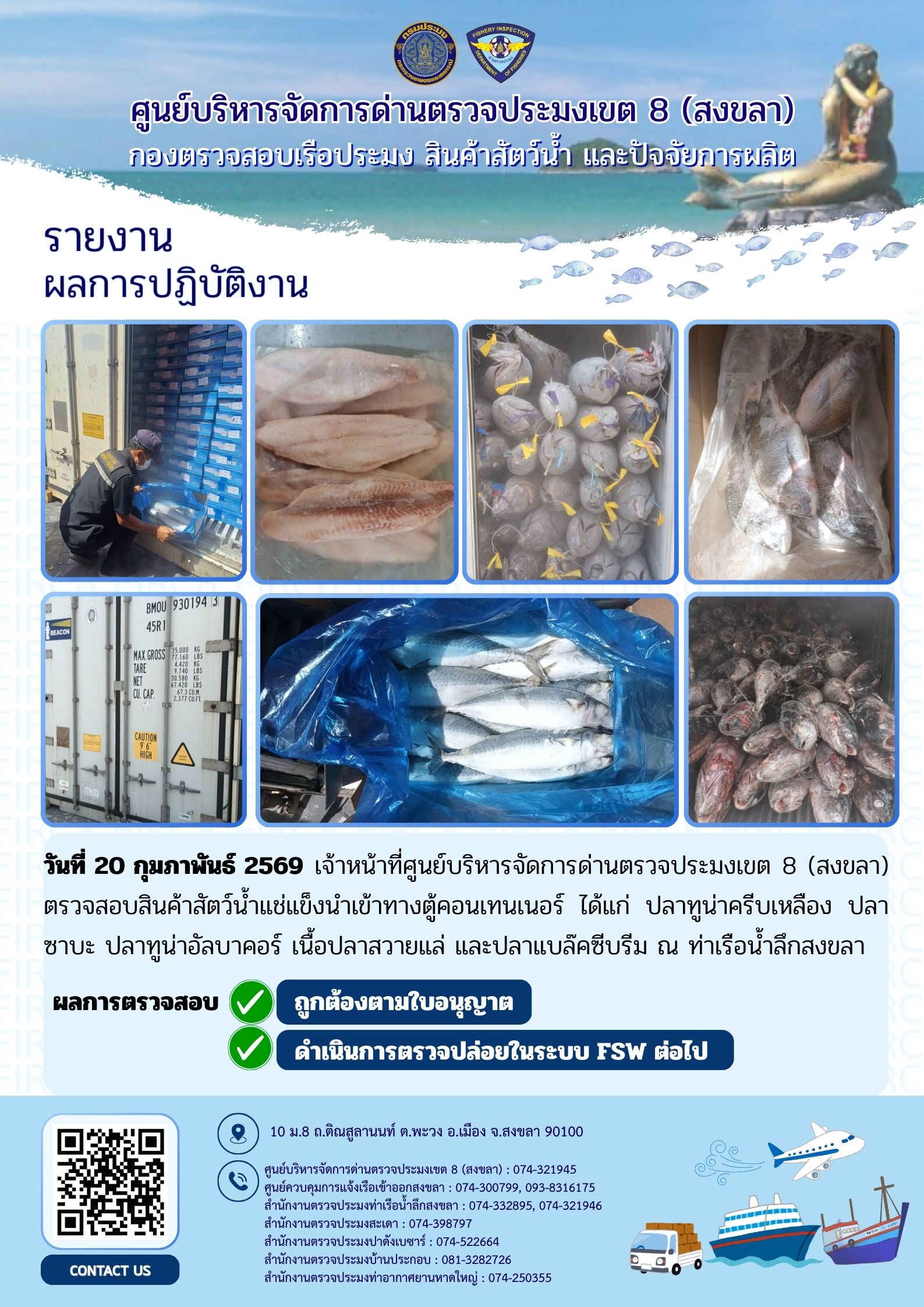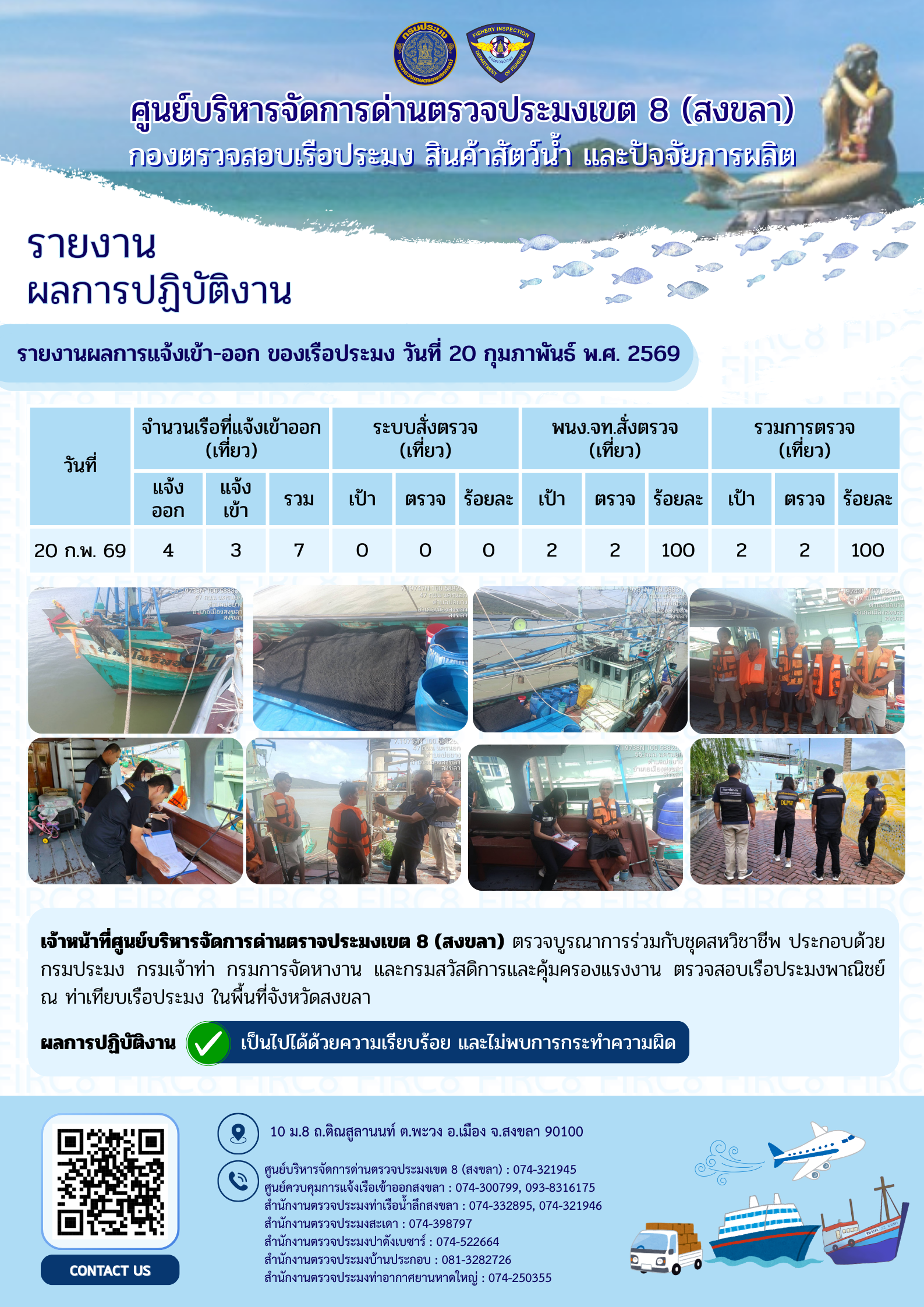 ผลการปฏิบัติงานศูนย์บริหารจัดการด่านตรวจประมงเขต 8 (สงขลา) ประจำวันที่ 20 กุมภาพันธ์ 2569
