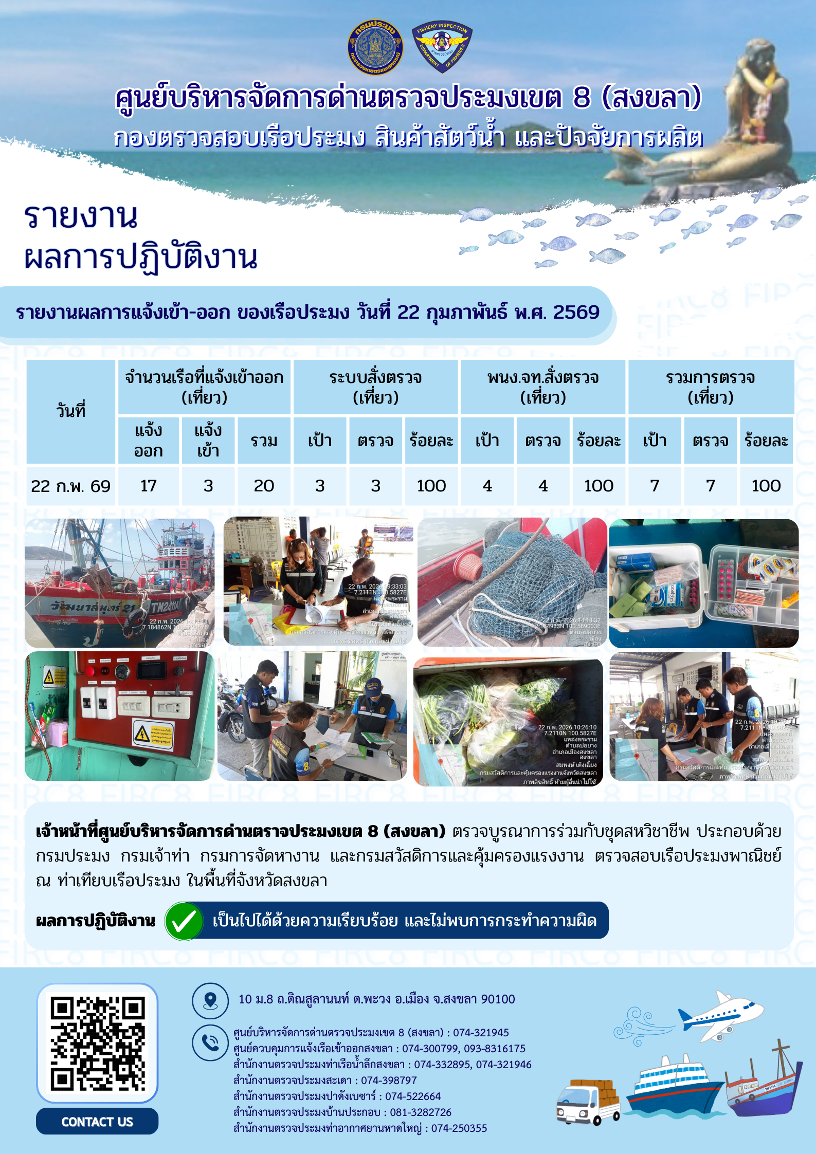 ผลการปฏิบัติงานศูนย์บริหารจัดการด่านตรวจประมงเขต 8 (สงขลา) ประจำวันที่ 22 กุมภาพันธ์ 2569