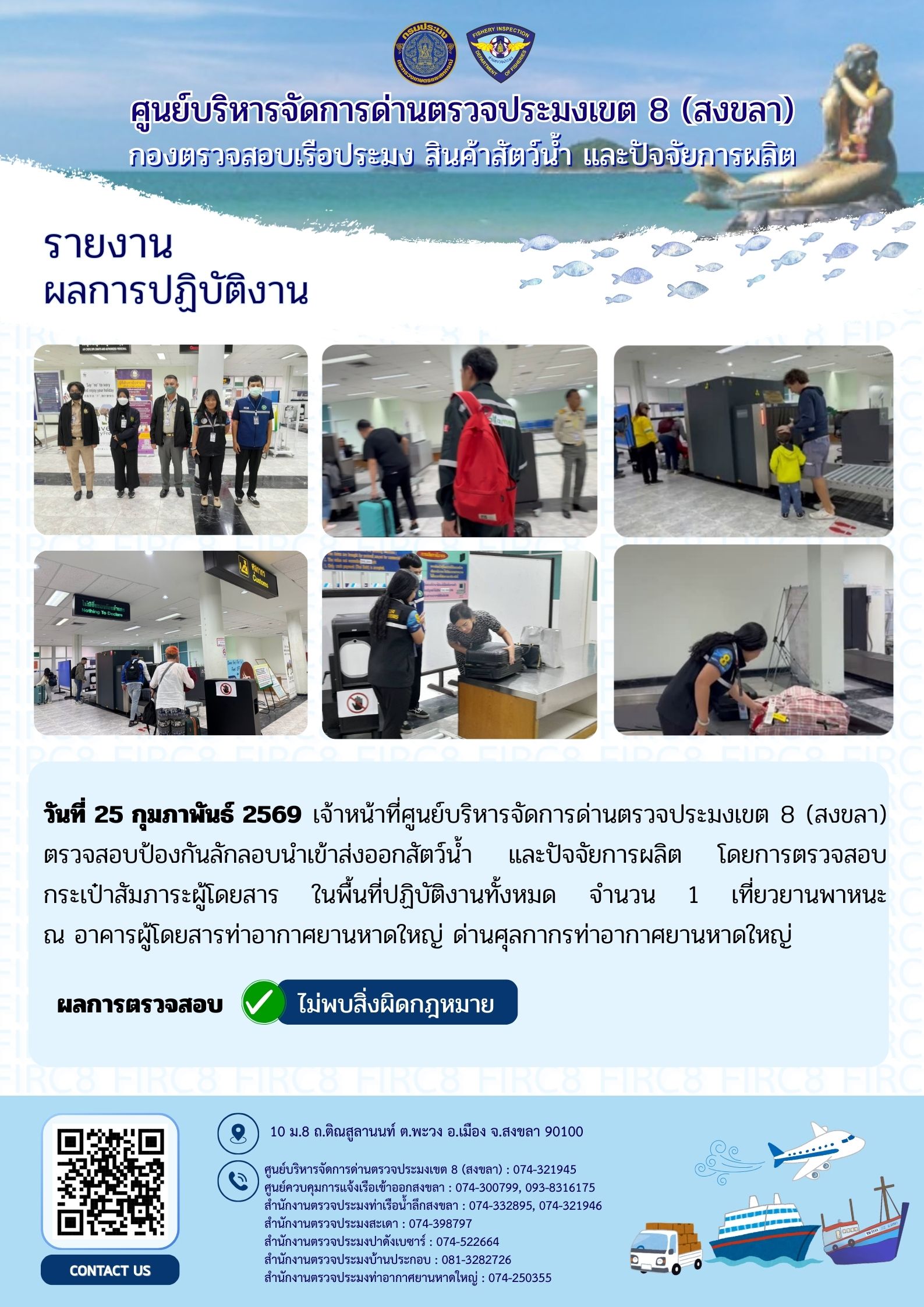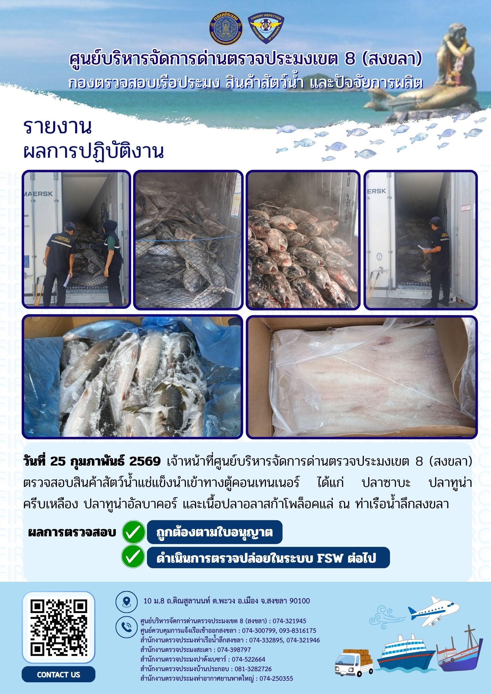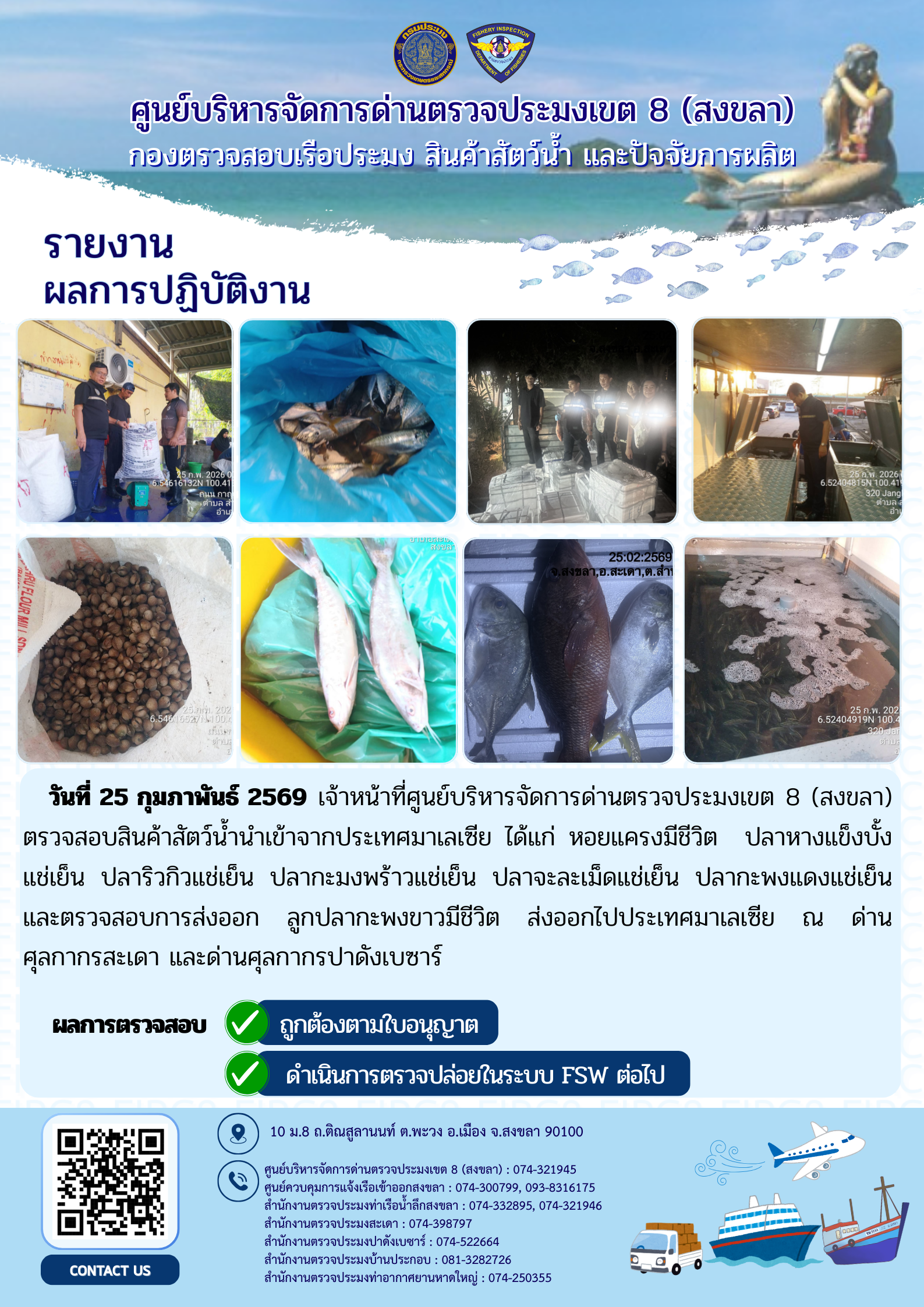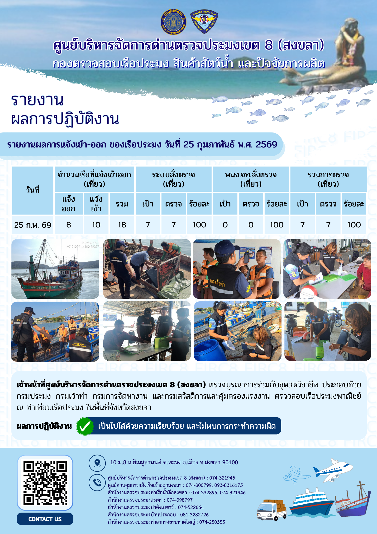 ผลการปฏิบัติงานศูนย์บริหารจัดการด่านตรวจประมงเขต 8 (สงขลา) ประจำวันที่ 25 กุมภาพันธ์ 2569