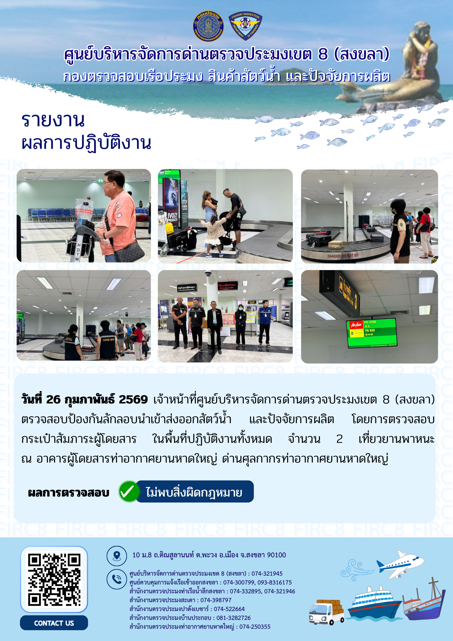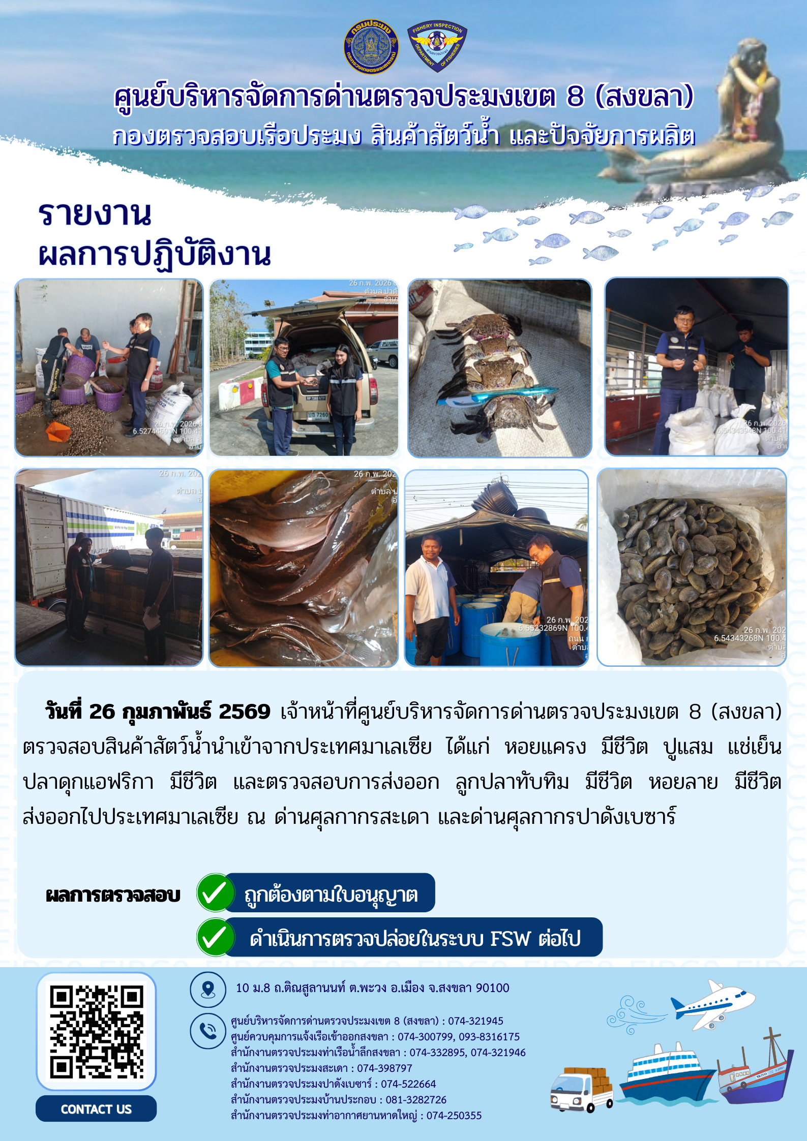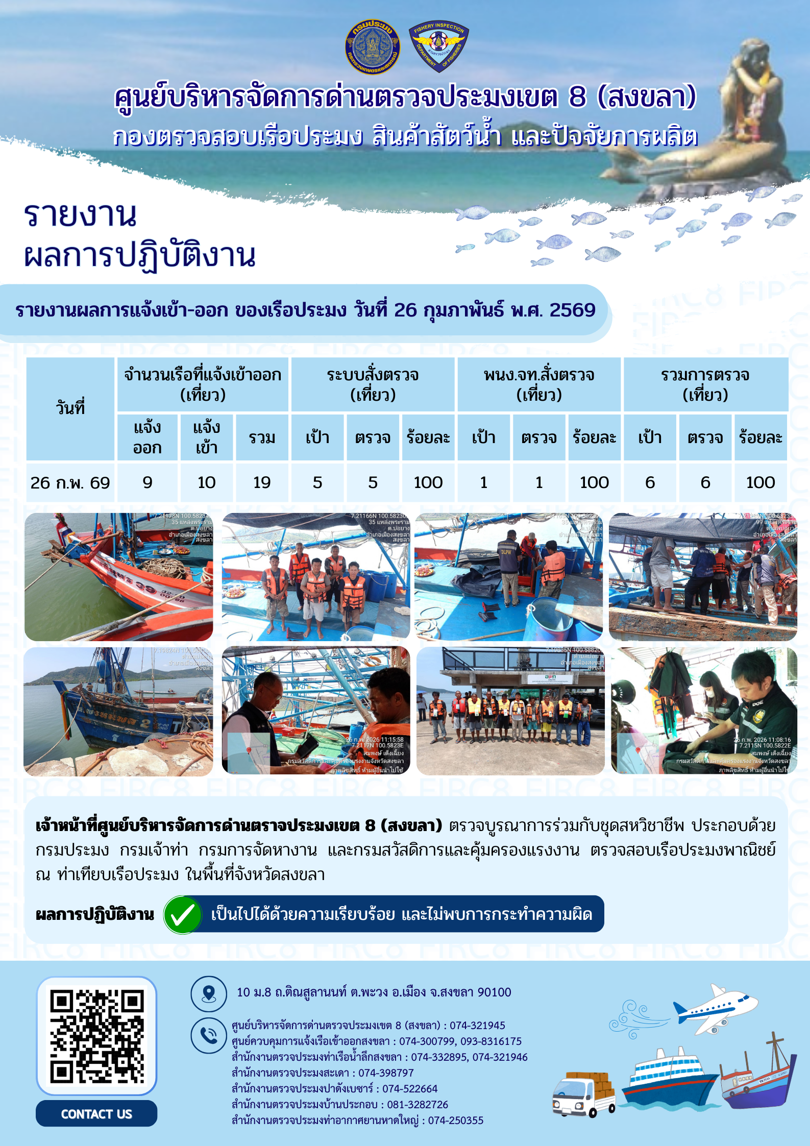 ผลการปฏิบัติงานศูนย์บริหารจัดการด่านตรวจประมงเขต 8 (สงขลา) ประจำวันที่ 26 กุมภาพันธ์ 2569